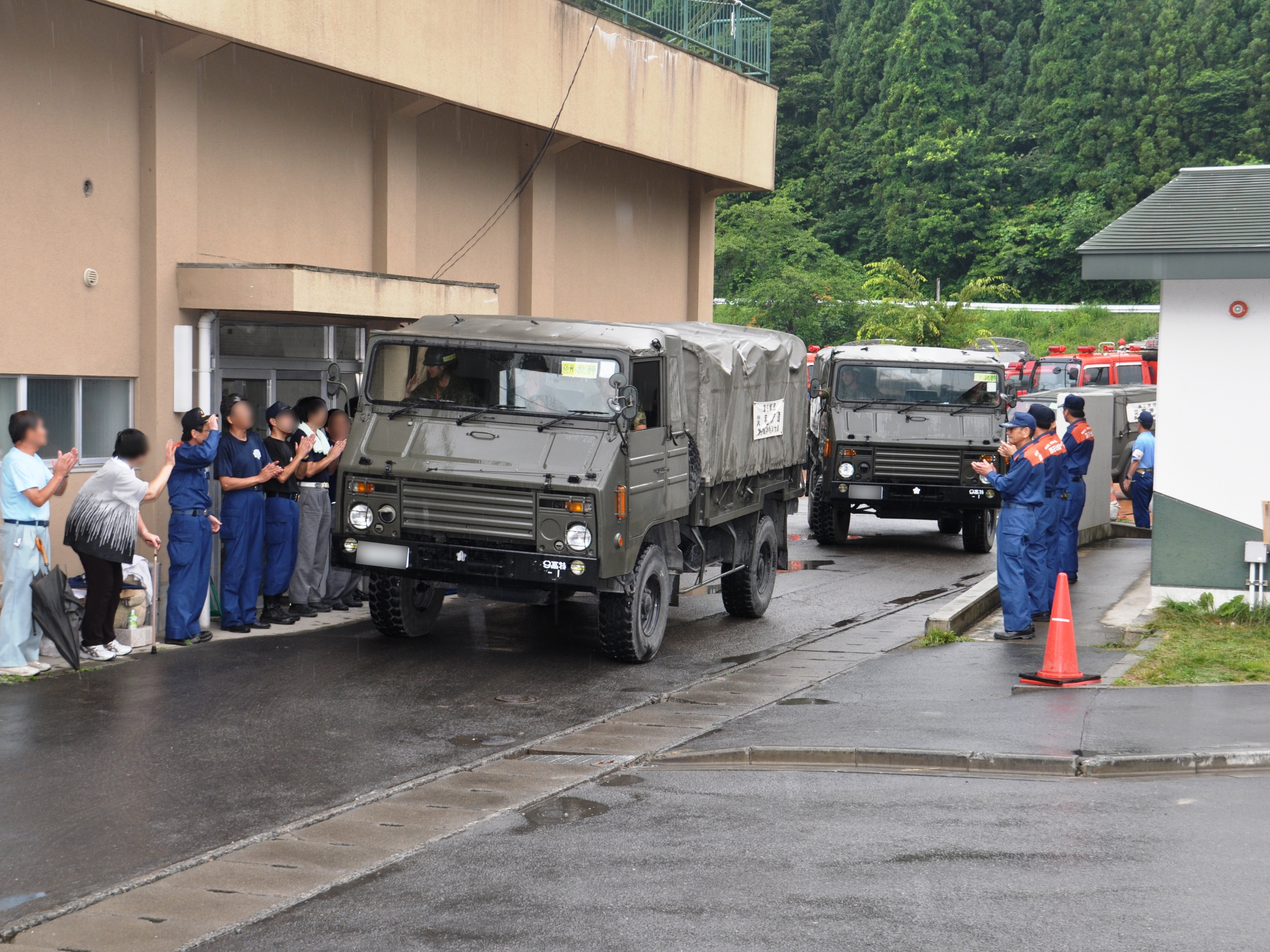 車で隊列を組んで撤退する自衛隊と雨の中それを見送る地元の方たちの様子