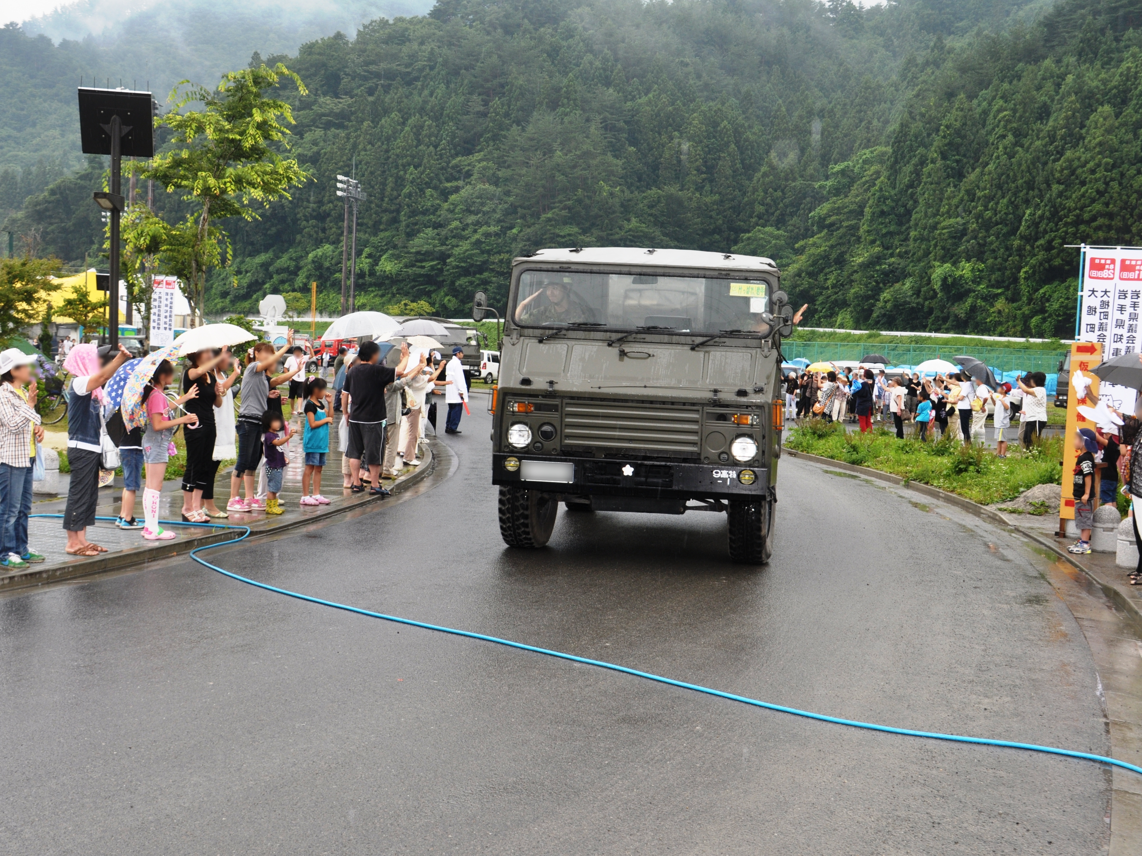 車で隊列を組んで撤退する自衛隊と雨の中それを見送る地元の方たちの様子