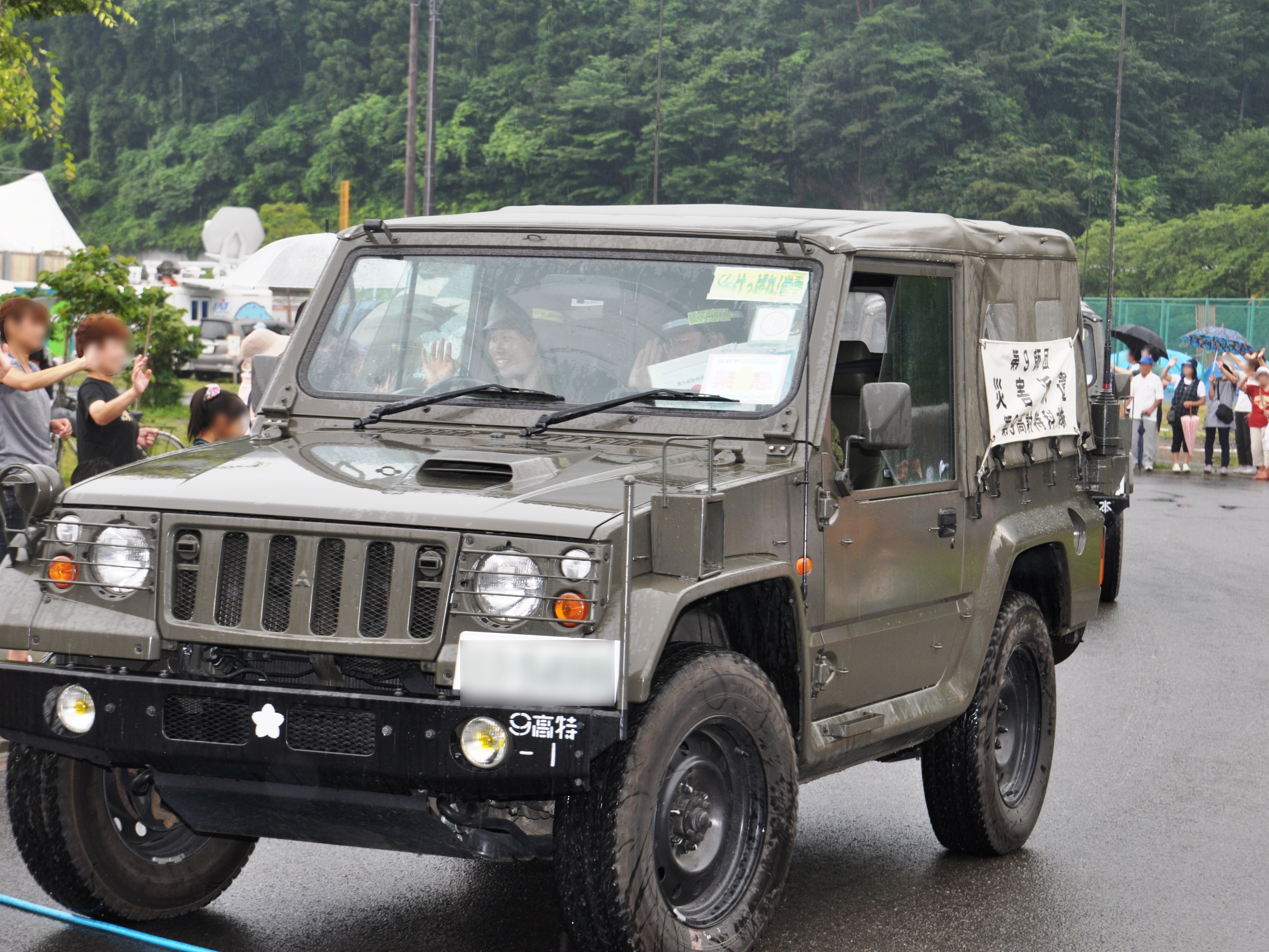 車で隊列を組んで撤退する自衛隊と雨の中それを見送る地元の方たちの様子