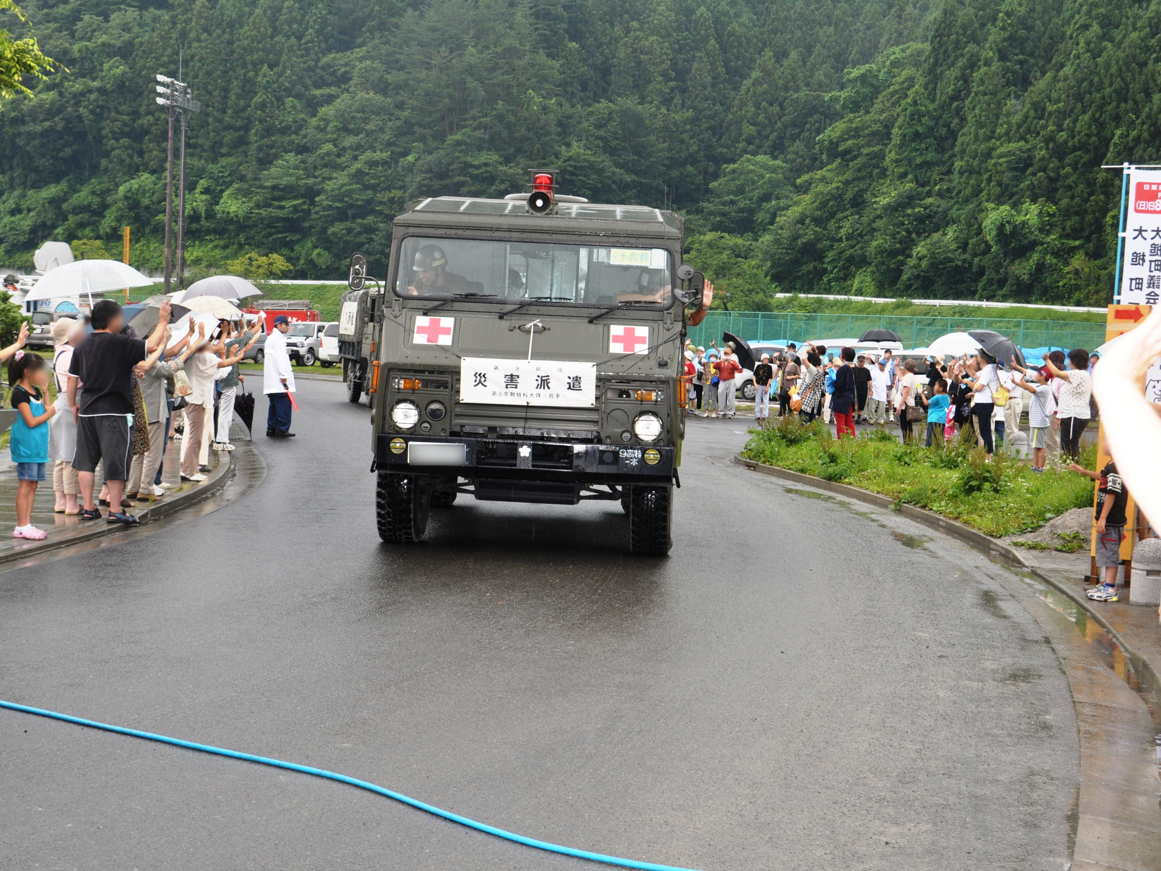 車で隊列を組んで撤退する自衛隊と雨の中それを見送る地元の方たちの様子