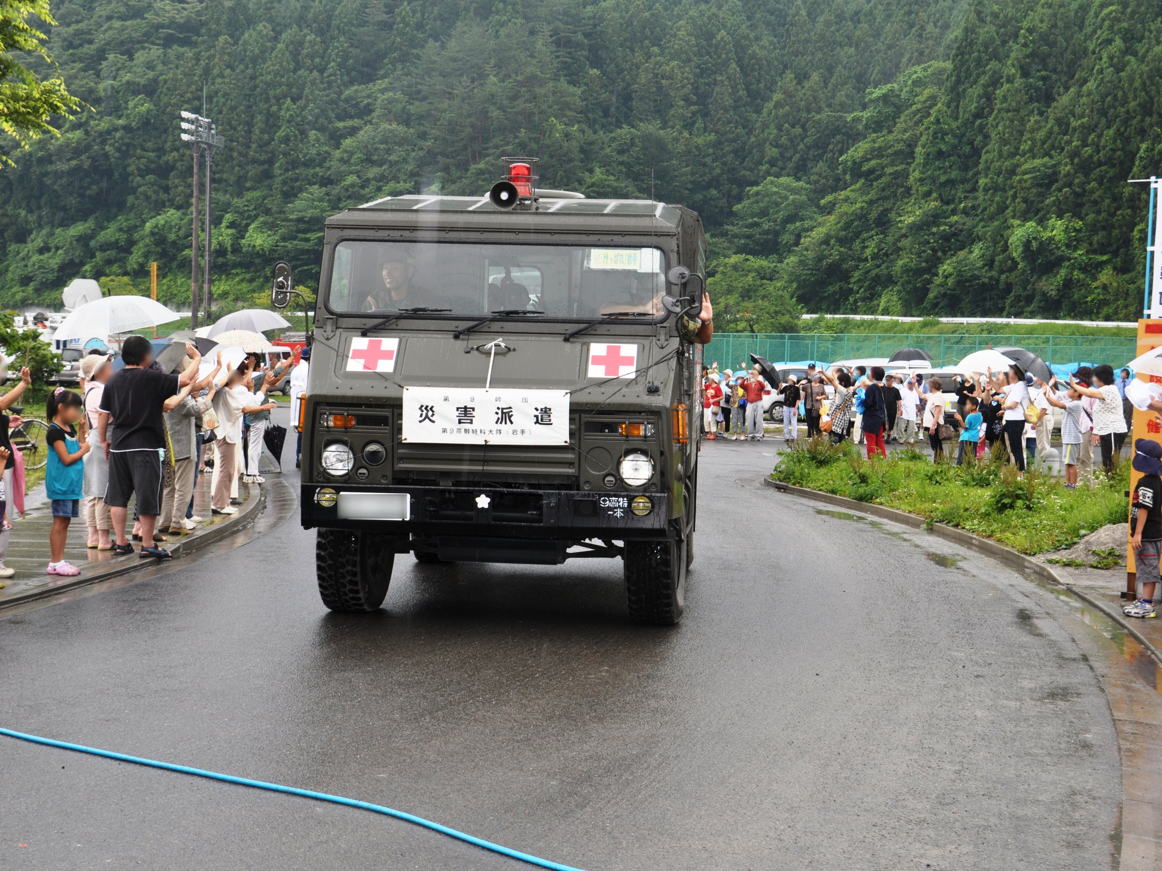 車で隊列を組んで撤退する自衛隊と雨の中それを見送る地元の方たちの様子
