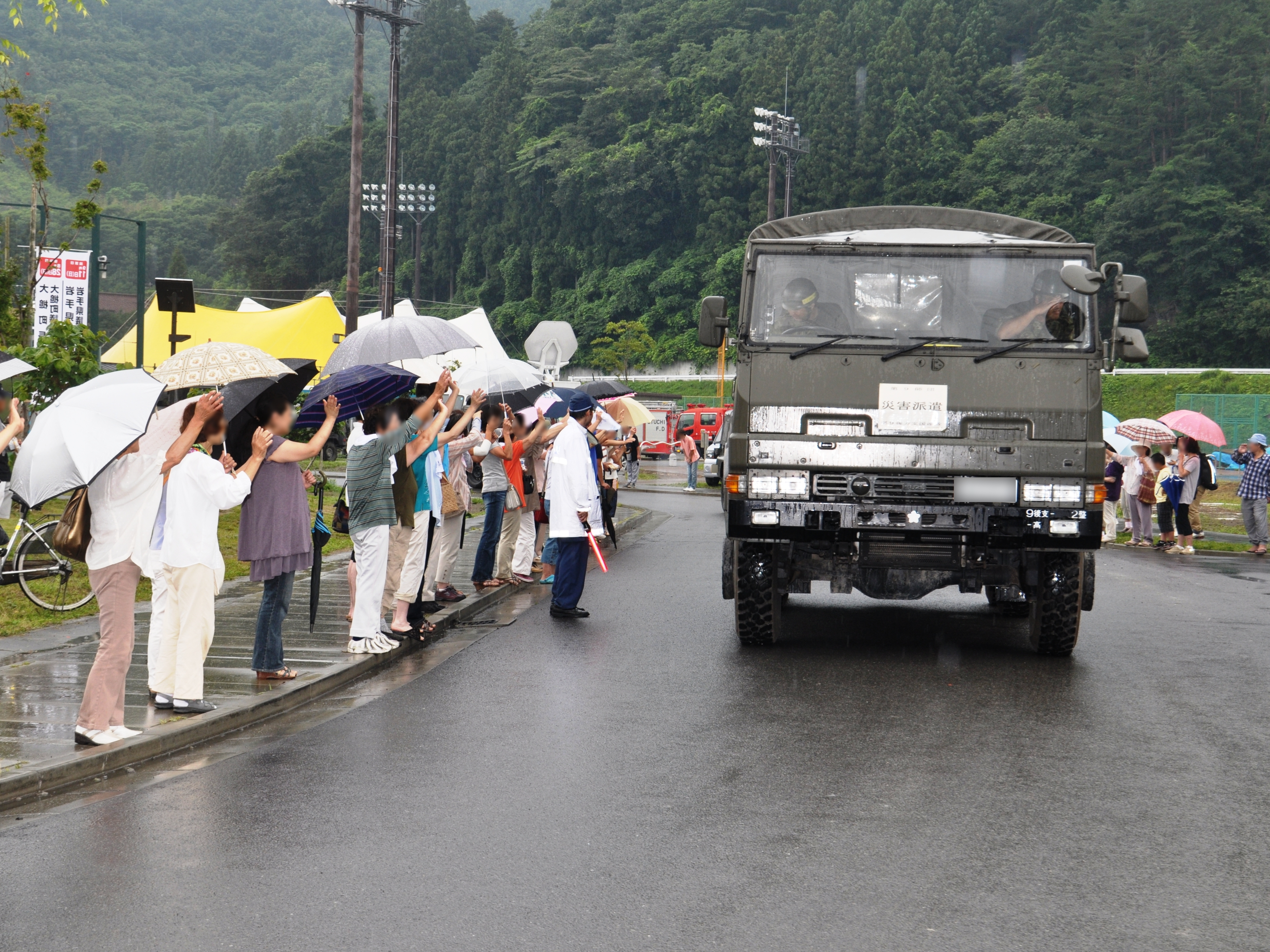 車で隊列を組んで撤退する自衛隊と雨の中それを見送る地元の方たちの様子