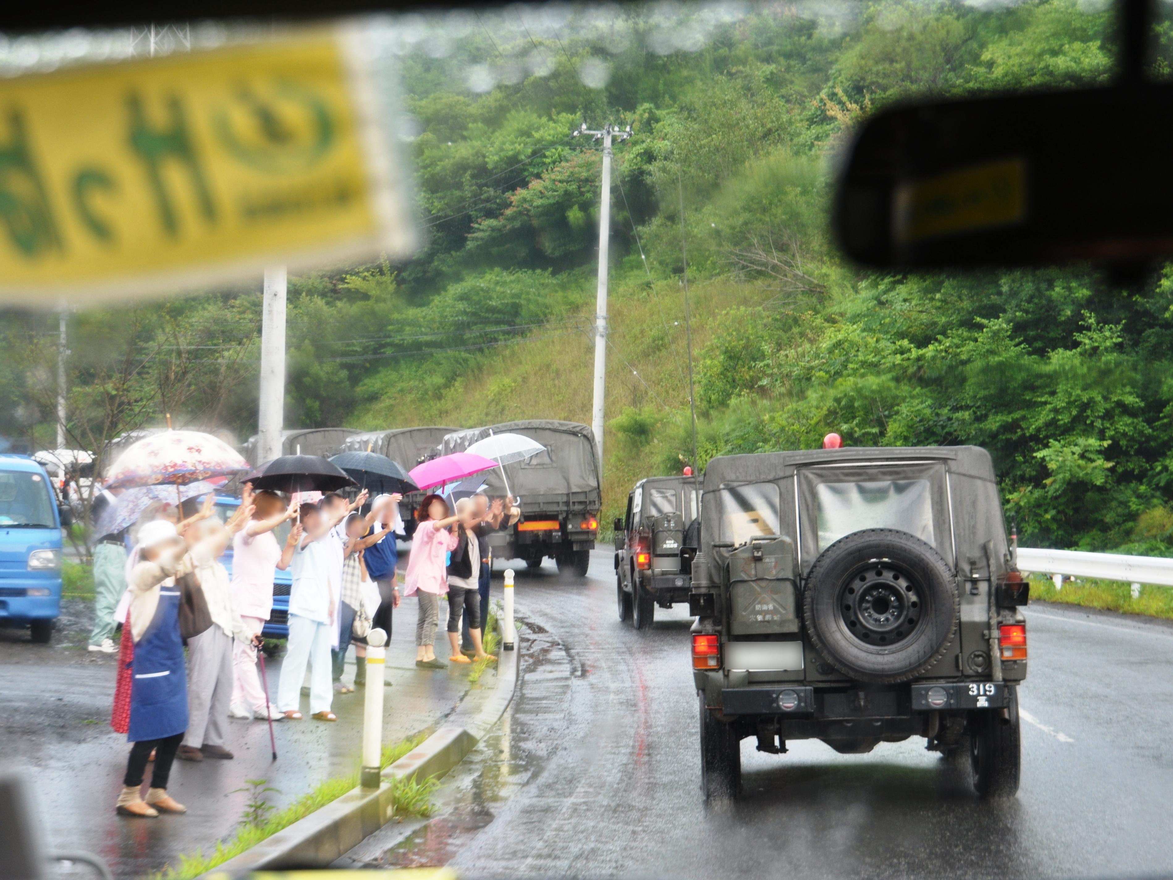 車で隊列を組んで撤退する自衛隊と雨の中それを見送る地元の方たちの様子