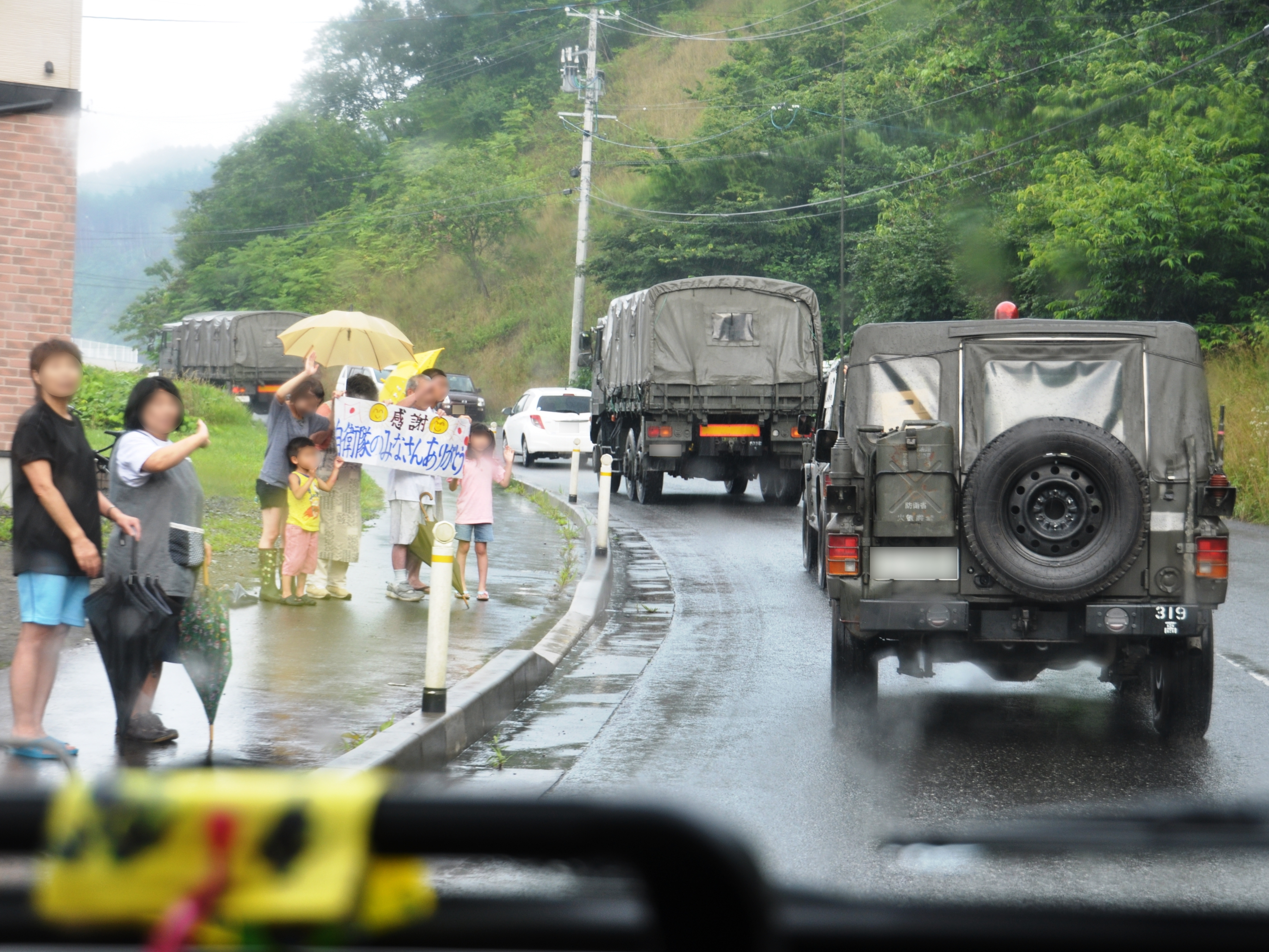 車で隊列を組んで撤退する自衛隊と雨の中それを見送る地元の方たちの様子