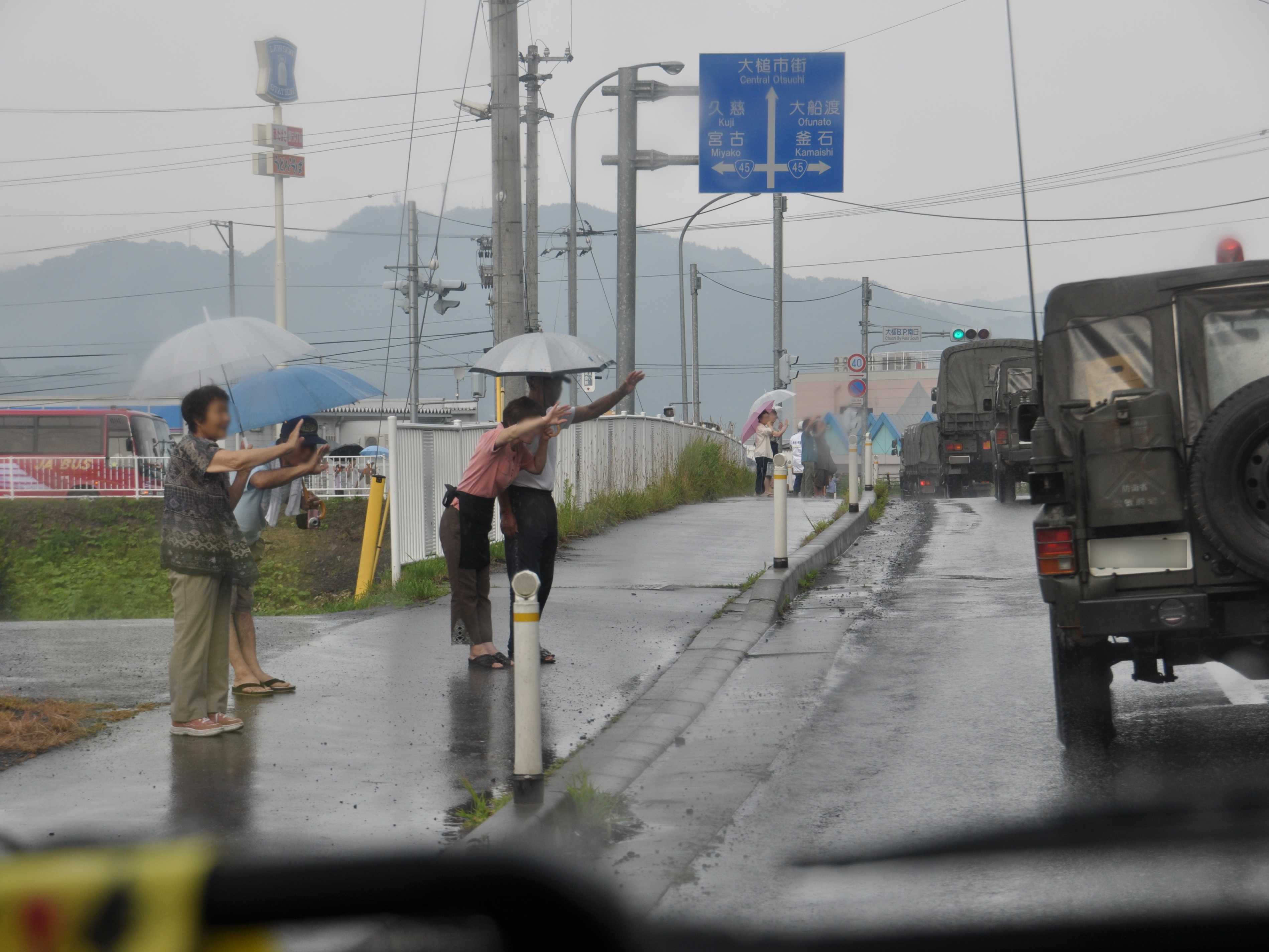 車で隊列を組んで撤退する自衛隊と雨の中それを見送る地元の方たちの様子