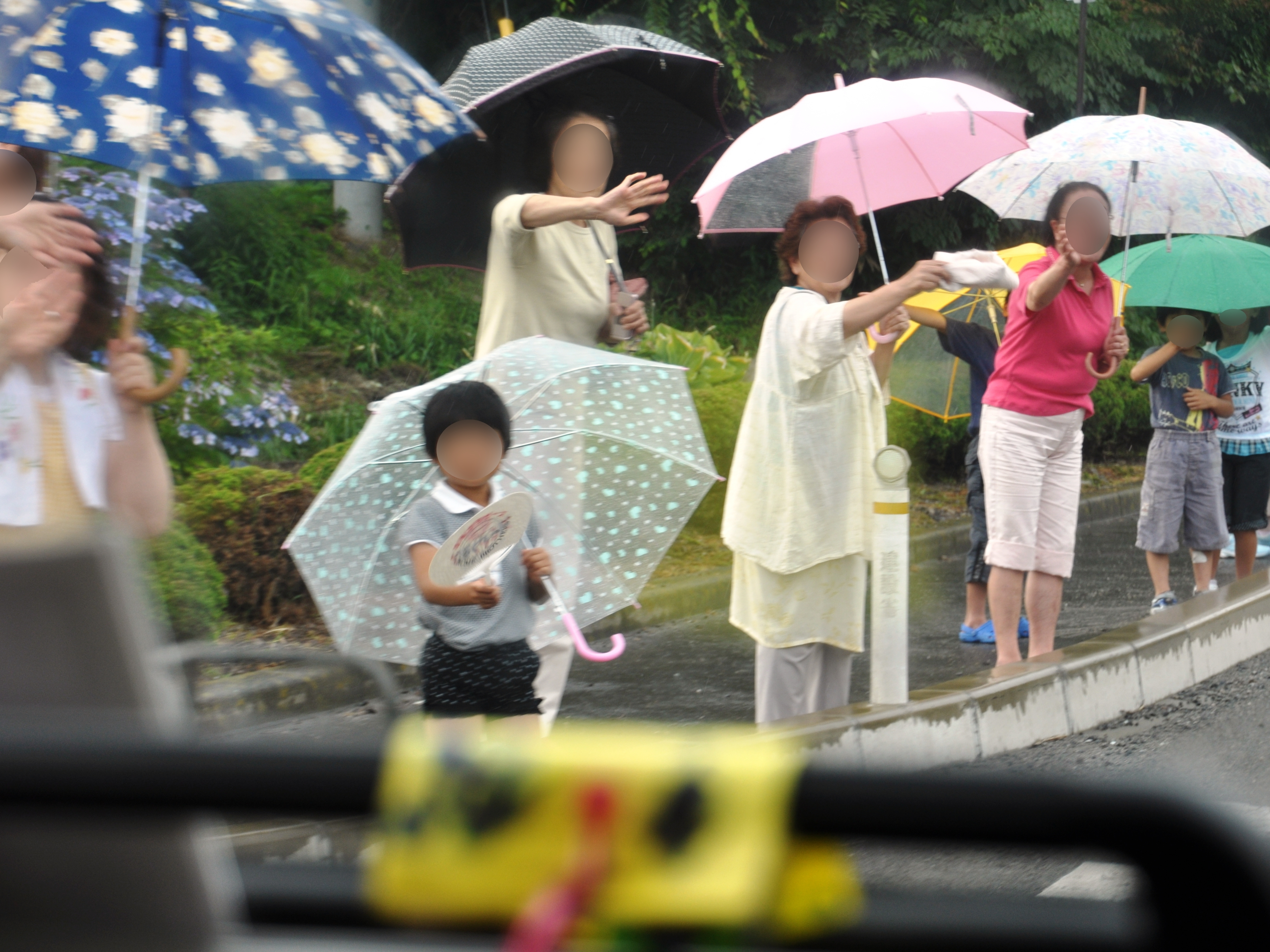 車で隊列を組んで撤退する自衛隊と雨の中それを見送る地元の方たちの様子