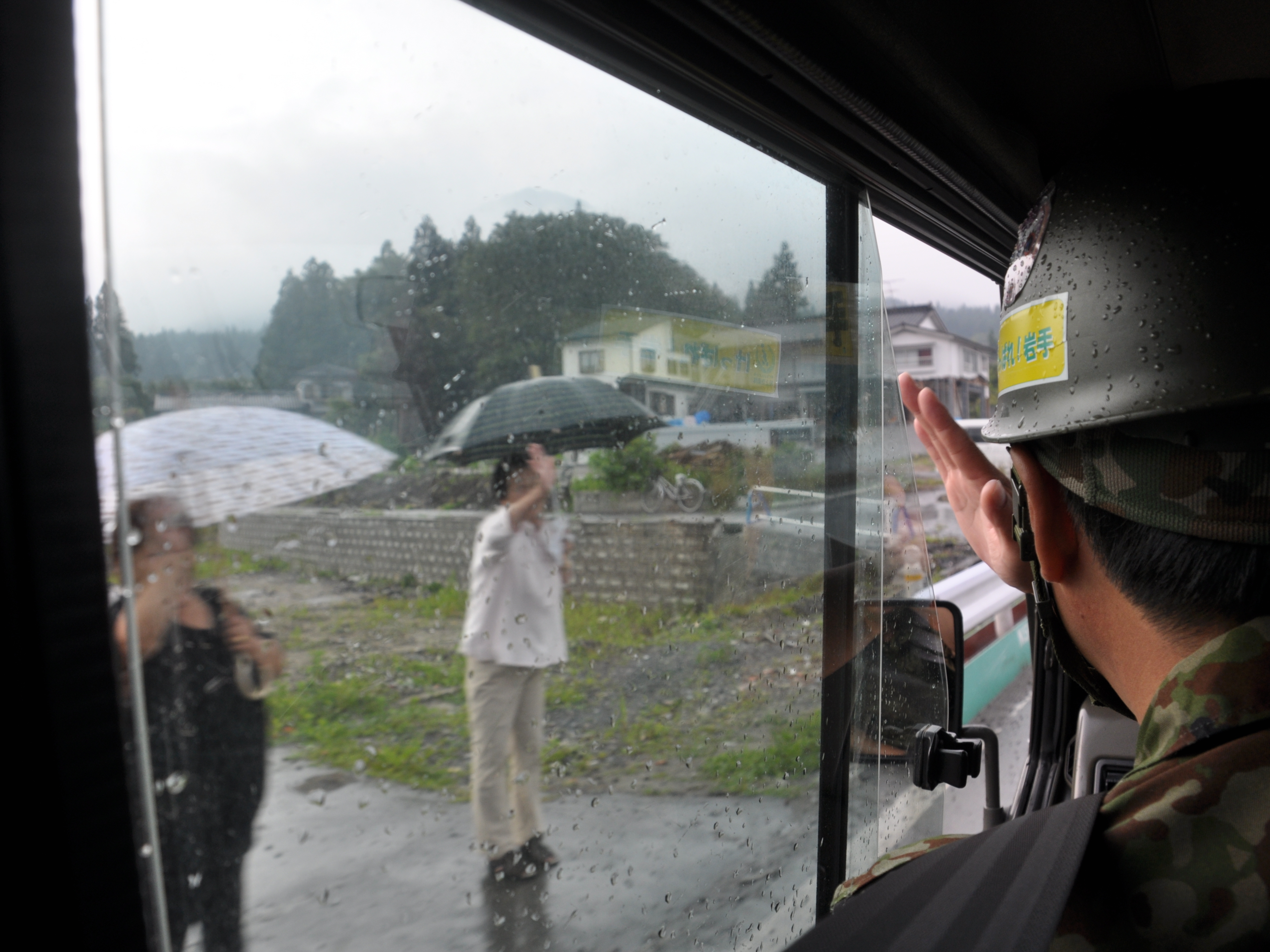 車で隊列を組んで撤退する自衛隊と雨の中それを見送る地元の方たちの様子