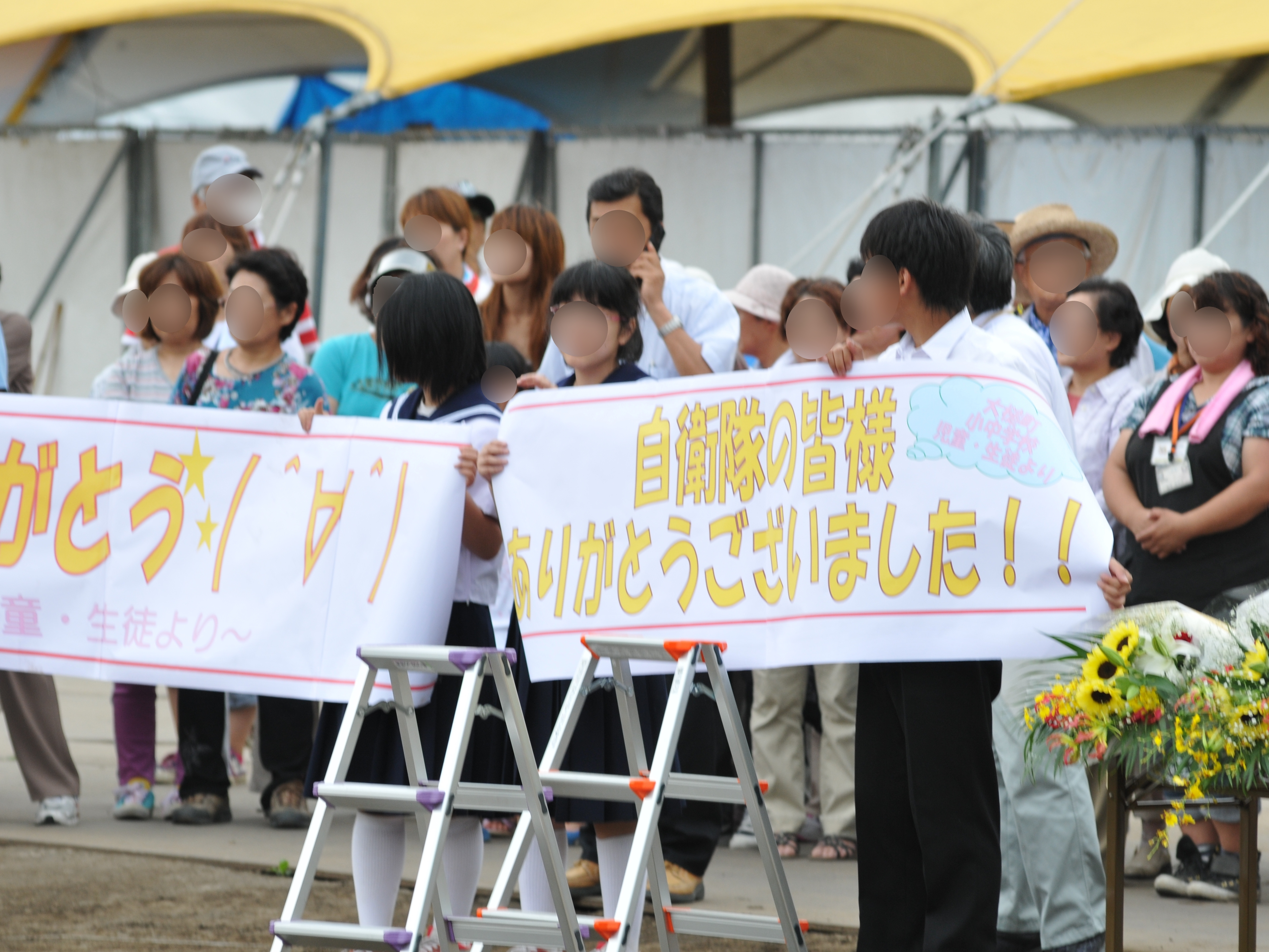 自衛隊への感謝のメッセージを書いた横断幕を持っている地元の方の様子