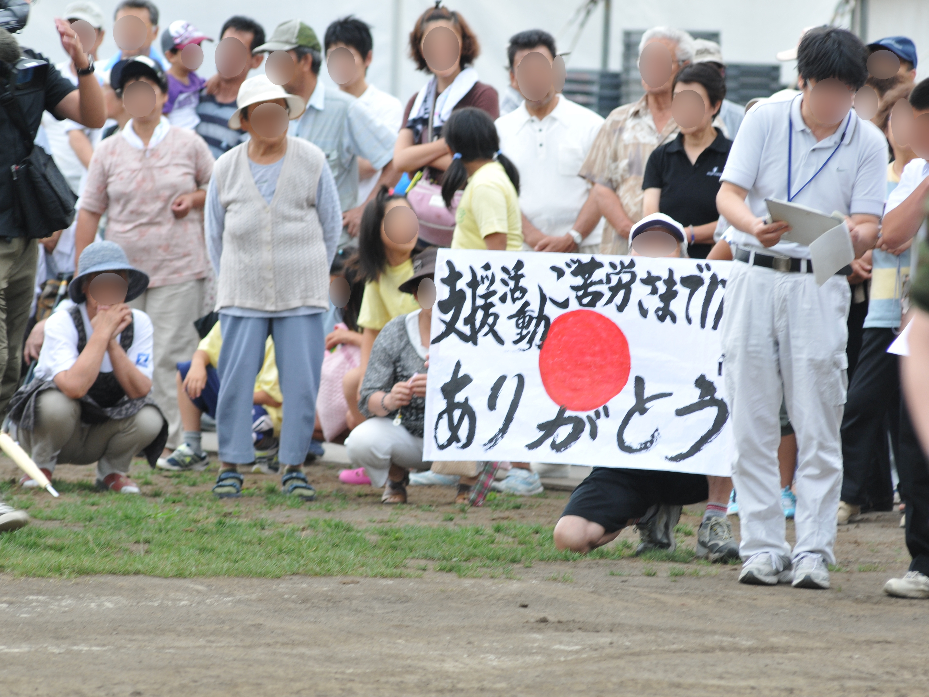 自衛隊への感謝のメッセージを書いた横断幕を持っている地元の方の様子