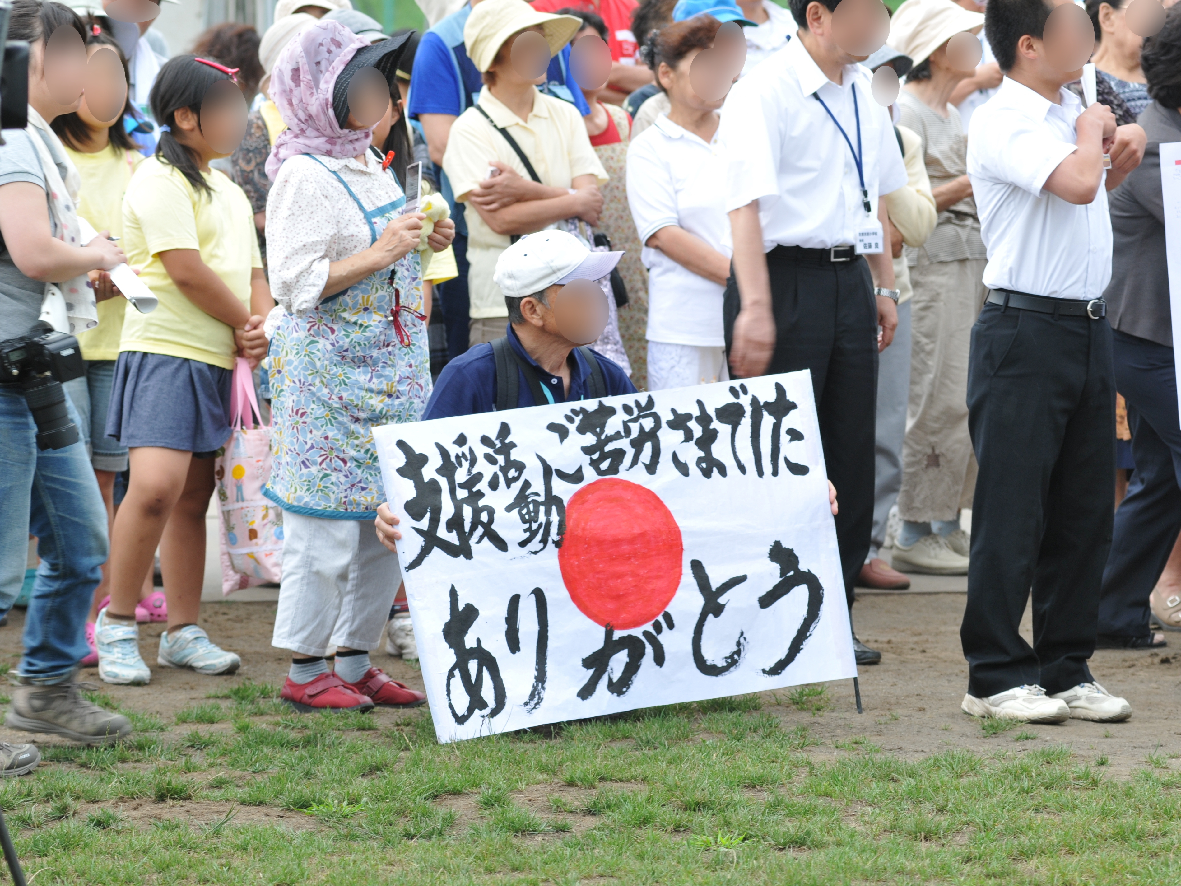 自衛隊への感謝のメッセージを書いた横断幕を持っている地元の方の様子