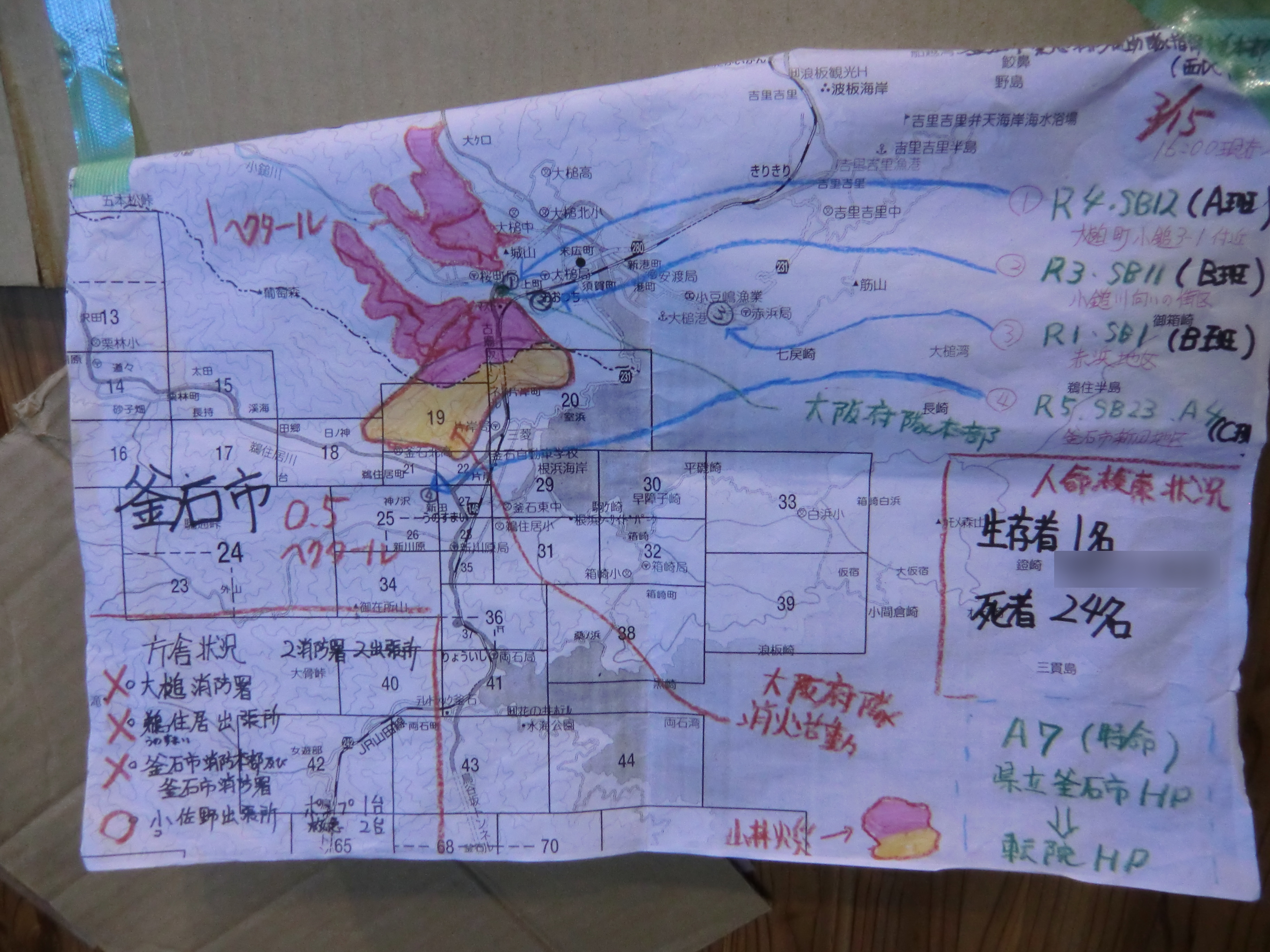大槌町地図 拡大表示 ダウンロード 識別子 : 2014 タイトルよみ : オオツチチョウチズ 說明・要約 : 地図上に記載されている被災状況 作成者(撮影者) : 堺市消防局 作成者(撮影者)よみ : サカイシショウボウキョク 提供者 : 堺市消防局 提供者よみ : サカイシショウボウキョク 撮影(作成)場所 : 岩手県遠野市 撮影(作成)場所よみ : イワテケントオノシ 作成日・撮影日 : 2011年 3月 19日 カテゴリー : 救助活動 捜索 地域 : その他 備考 : 堺市消防局提供