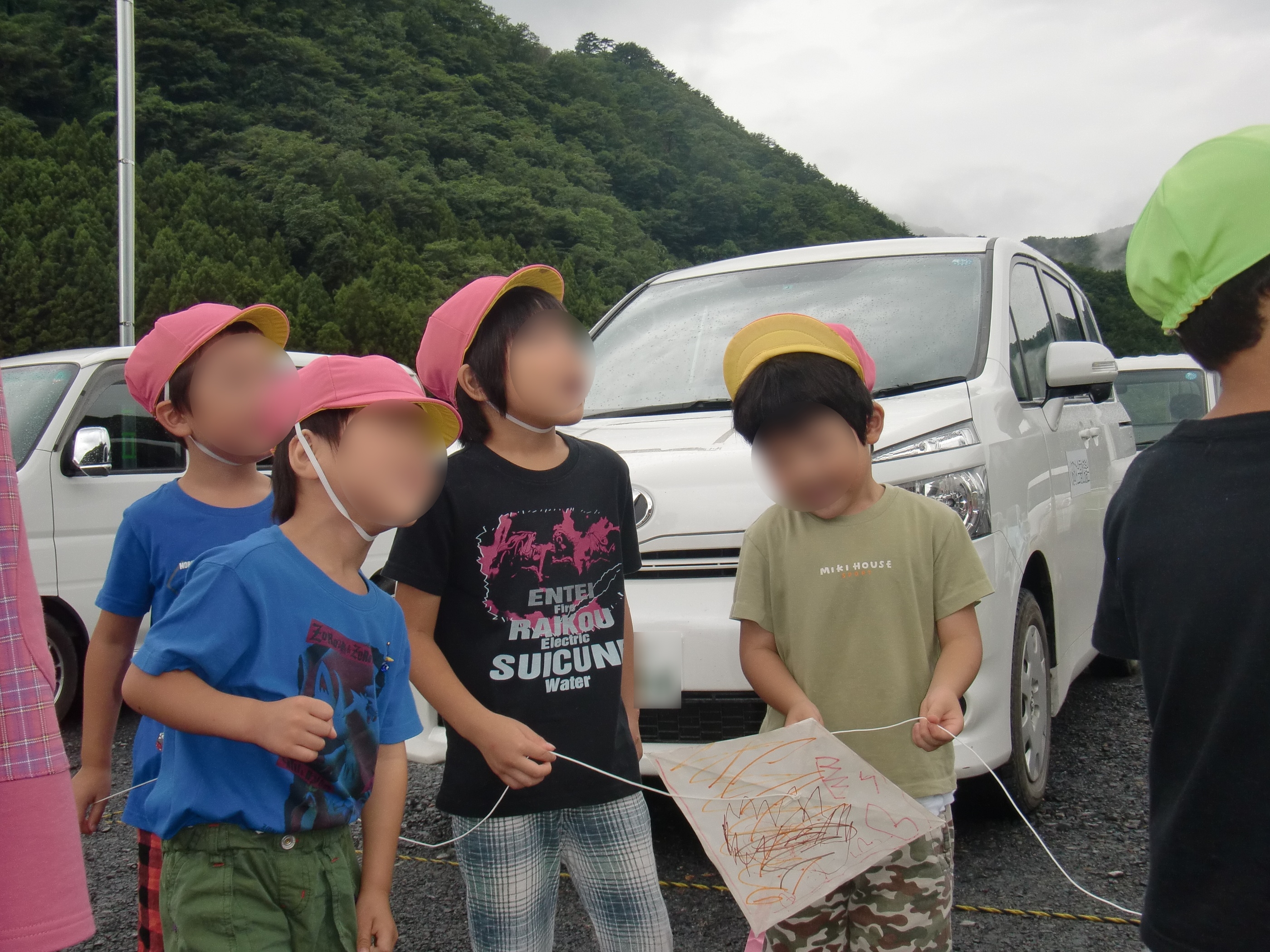 外で凧揚げの準備をしている子供たちの様子