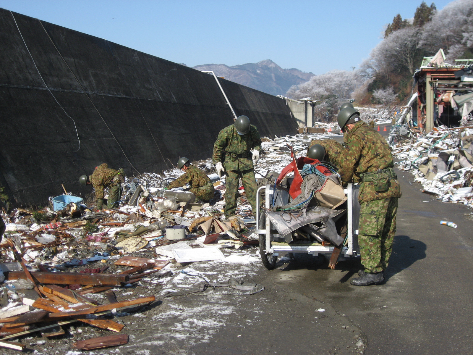 ガレキ撤去作業 拡大表示 ダウンロード 識別子 : 2374 タイトルよみ : ガレキテッキョサギョウ 說明・要約 : ガレキの撤去作業をしている自衛隊員 作成者(撮影者) : 自衛隊 作成者(撮影者)よみ : ジエイタイ 提供者 : 自衛隊 提供者よみ : ジエイタイ 撮影(作成)場所 : 岩手県上閉伊郡大槌町 撮影(作成)場所よみ : イワテケンカミヘイグンオオツチチョウ 作成日・撮影日 : 2011年 3月 27日 カテゴリー : がれき処理 その他 地域 : 安渡地区 備考 : 震災事象 ガレキ・啓開・インフラ復旧 > ガレキ処理 > ガレキ処理