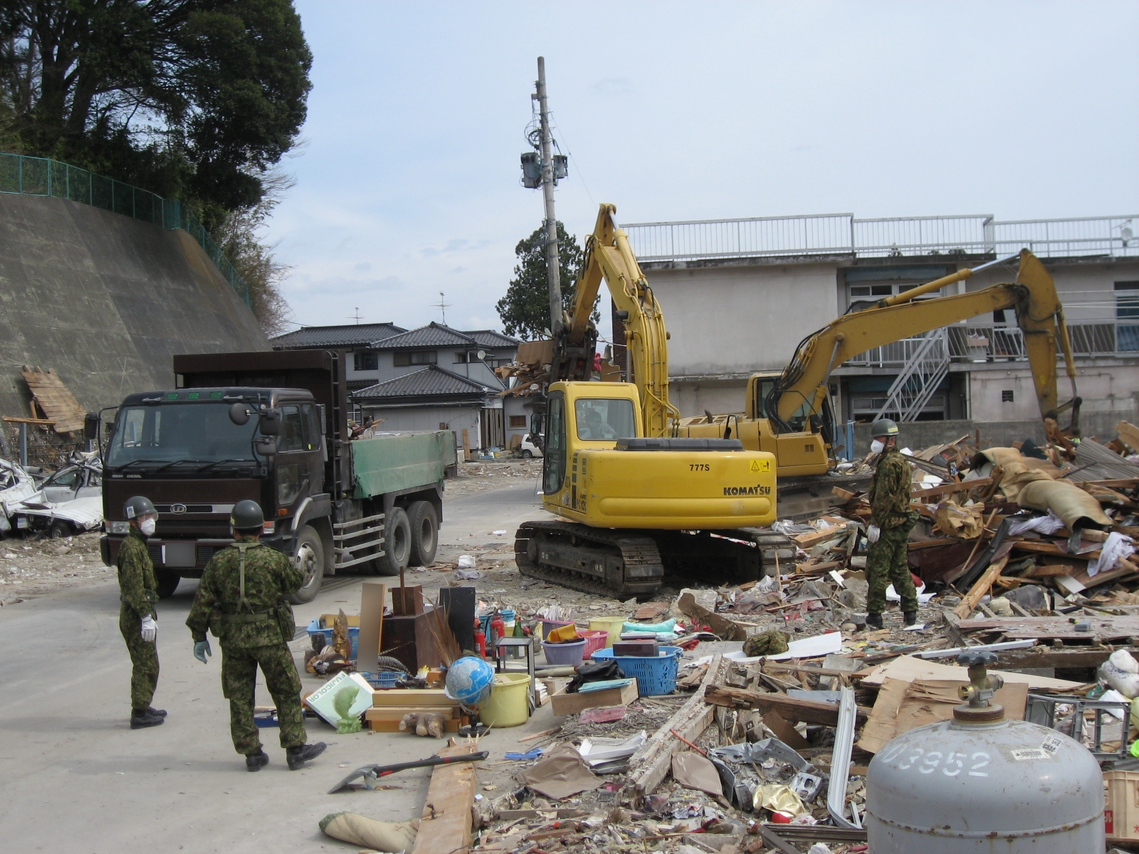 ガレキ撤去作業 拡大表示 ダウンロード 識別子 : 2377 タイトルよみ : ガレキテッキョサギョウ 說明・要約 : ガレキの撤去作業をしている自衛隊員 作成者(撮影者) : 自衛隊 作成者(撮影者)よみ : ジエイタイ 提供者 : 自衛隊 提供者よみ : ジエイタイ 撮影(作成)場所 : 岩手県上閉伊郡大槌町 撮影(作成)場所よみ : イワテケンカミヘイグンオオツチチョウ 作成日・撮影日 : 2011年 4月 8日 カテゴリー : がれき処理 その他 地域 : 安渡地区 備考 : 震災事象 ガレキ・啓開・インフラ復旧 > ガレキ処理 > ガレキ処理