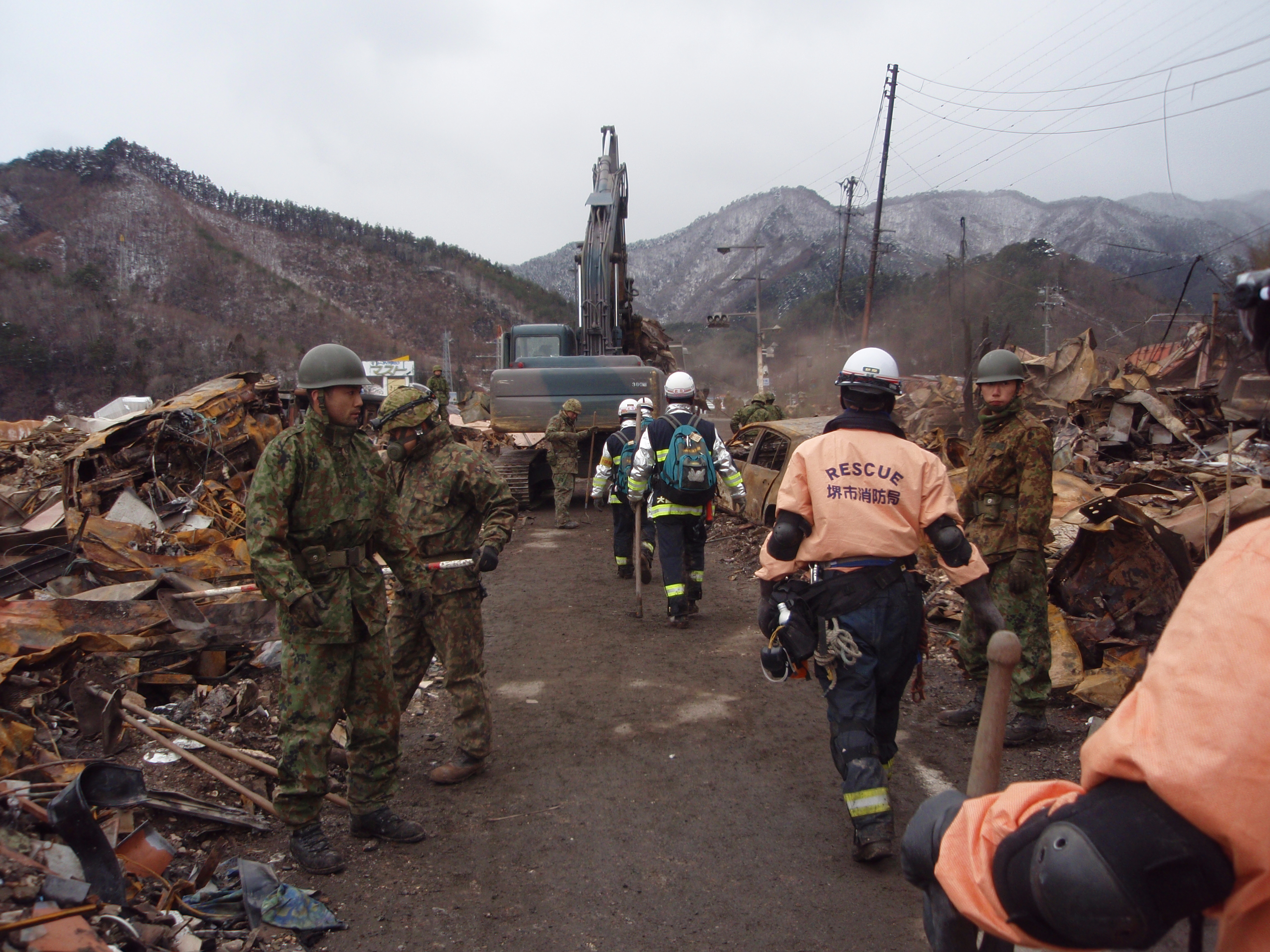 道路啓開中 拡大表示 ダウンロード 識別子 : 2600 タイトルよみ : ドウロケイカイチュウ 說明・要約 : 道路啓開中の様子、自衛隊員と消防隊員の様子 作成者(撮影者) : 堺市消防局 作成者(撮影者)よみ : サカイシショウボウキョク 提供者 : 堺市消防局 提供者よみ : サカイシショウボウキョク 撮影(作成)場所 : 岩手県上閉伊郡大槌町 撮影(作成)場所よみ : イワテケンカミヘイグンオオツチチョウ 作成日・撮影日 : 2011年 3月 16日 カテゴリー : 道路啓開 その他 地域 : 町方地区 備考 : 堺市消防局提供 震災事象 ガレキ・啓開・インフラ復旧 > 道路啓開 > 道路啓開