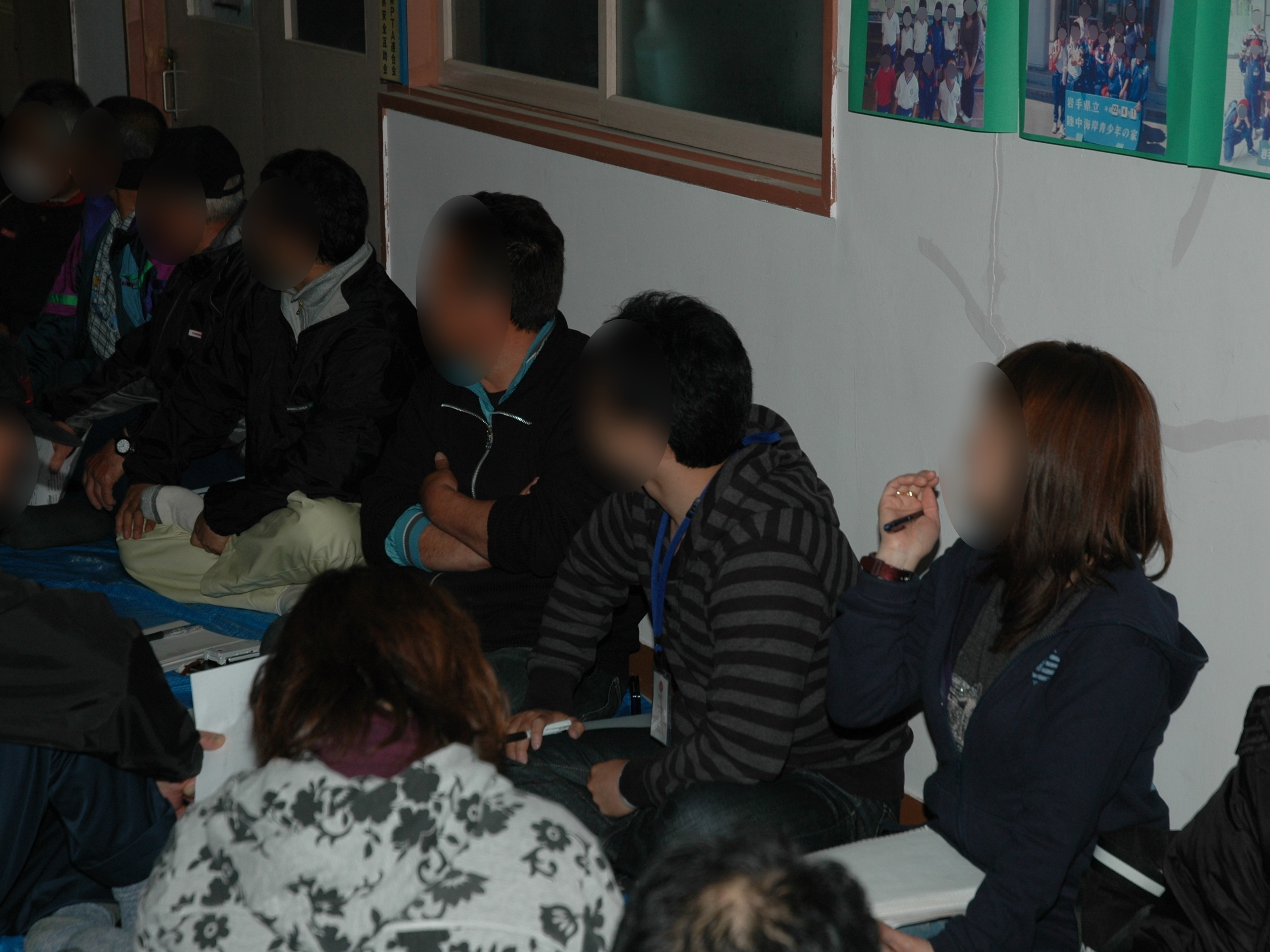 安渡小学校の校舎内廊下で開催された第1回大槌まちづくり住民会議の様子