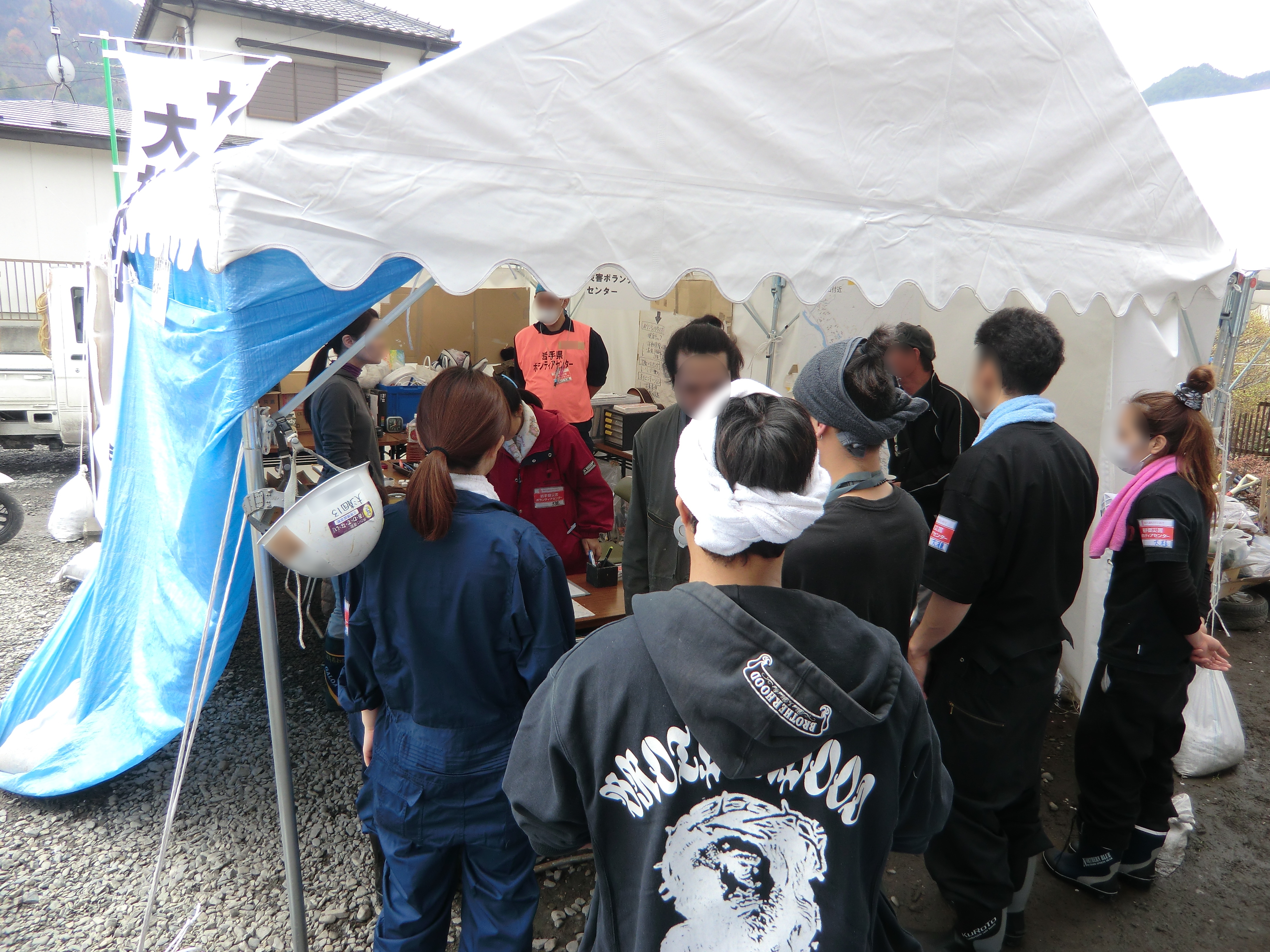 テントの前で打合せをしているボランティアとスタッフの様子