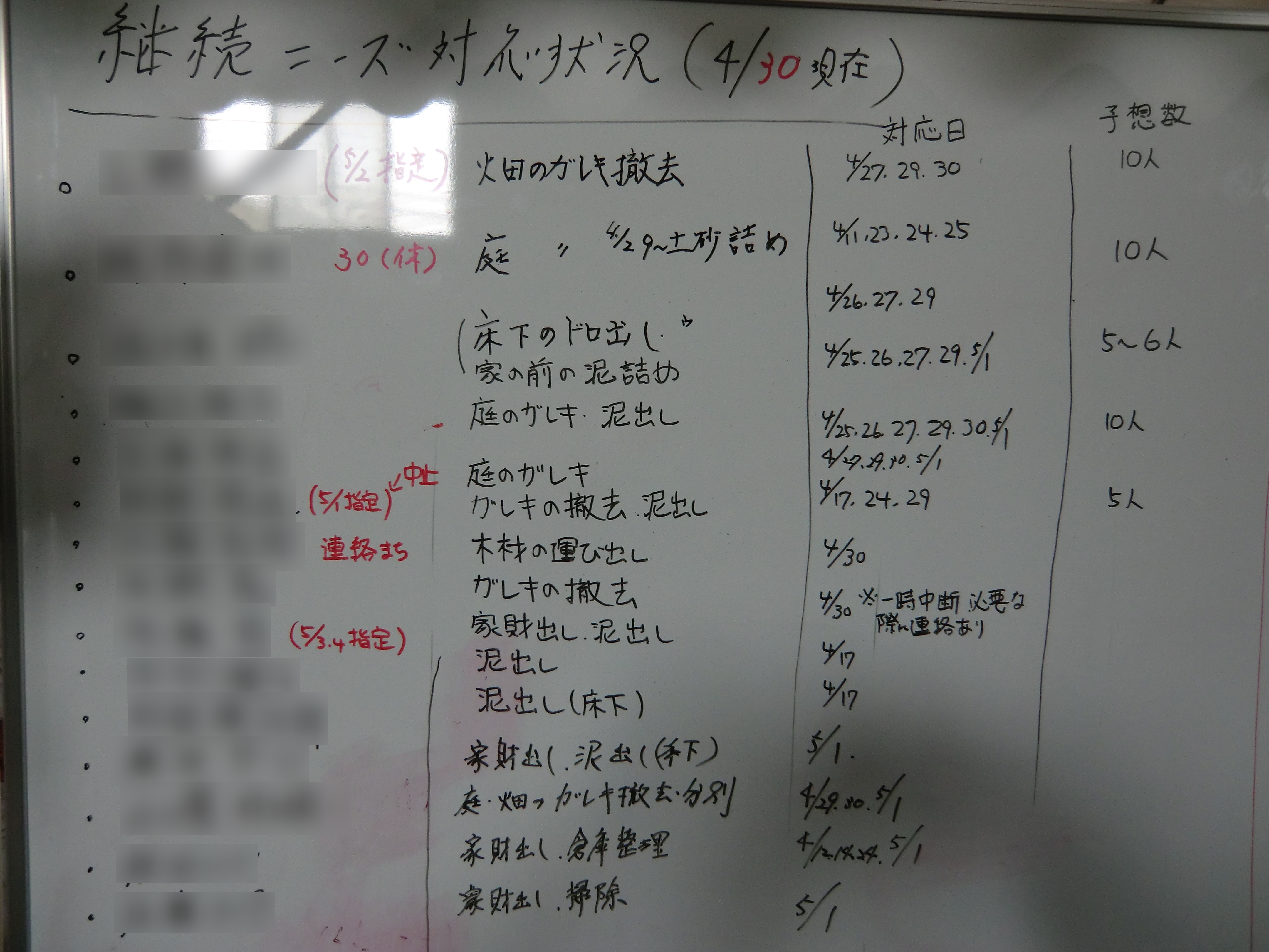 黒板に書かれている担当者の予定表