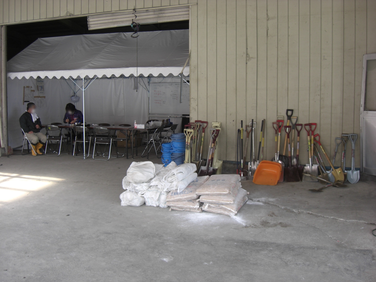 テント内で作業をしている様子と、テントの前に作業用の道具が準備されている様子
