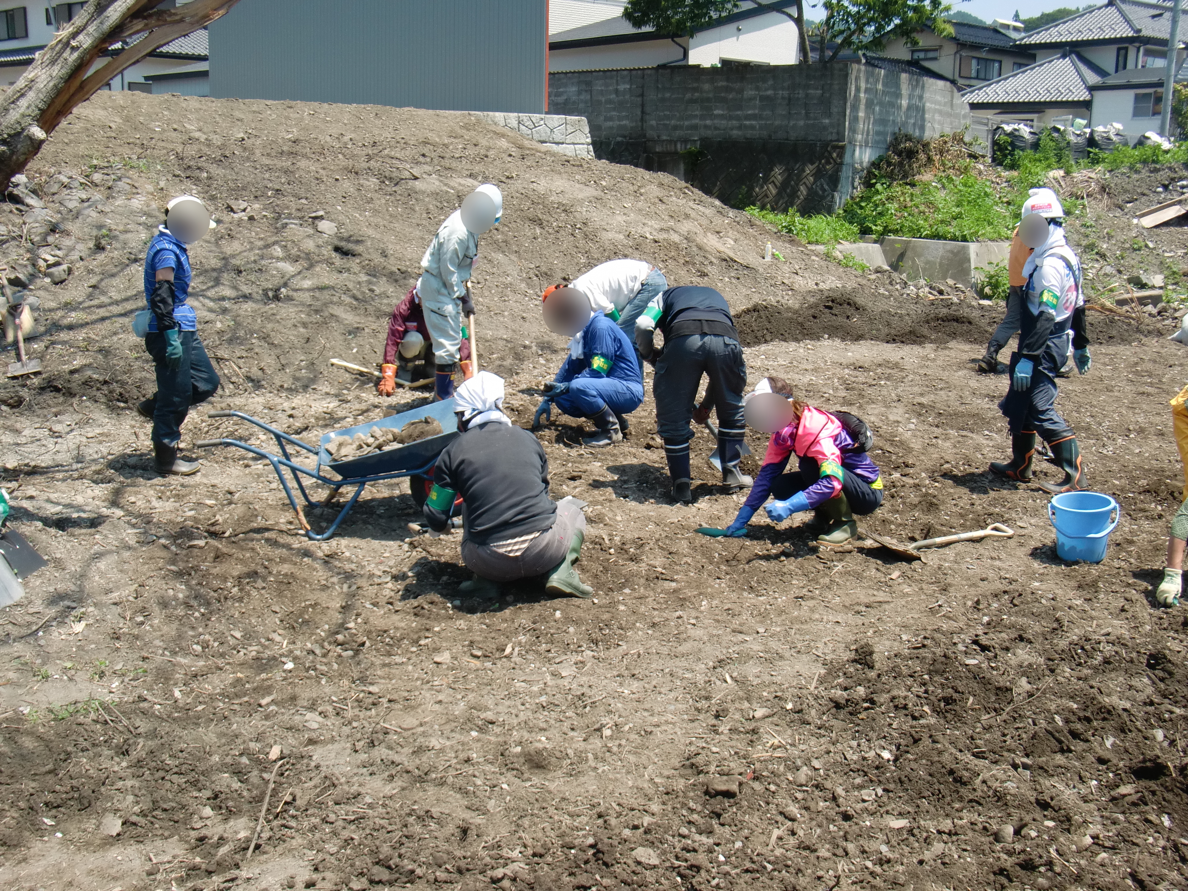 河川敷を耕し、菜の花の種をまいているボランティアの人たち