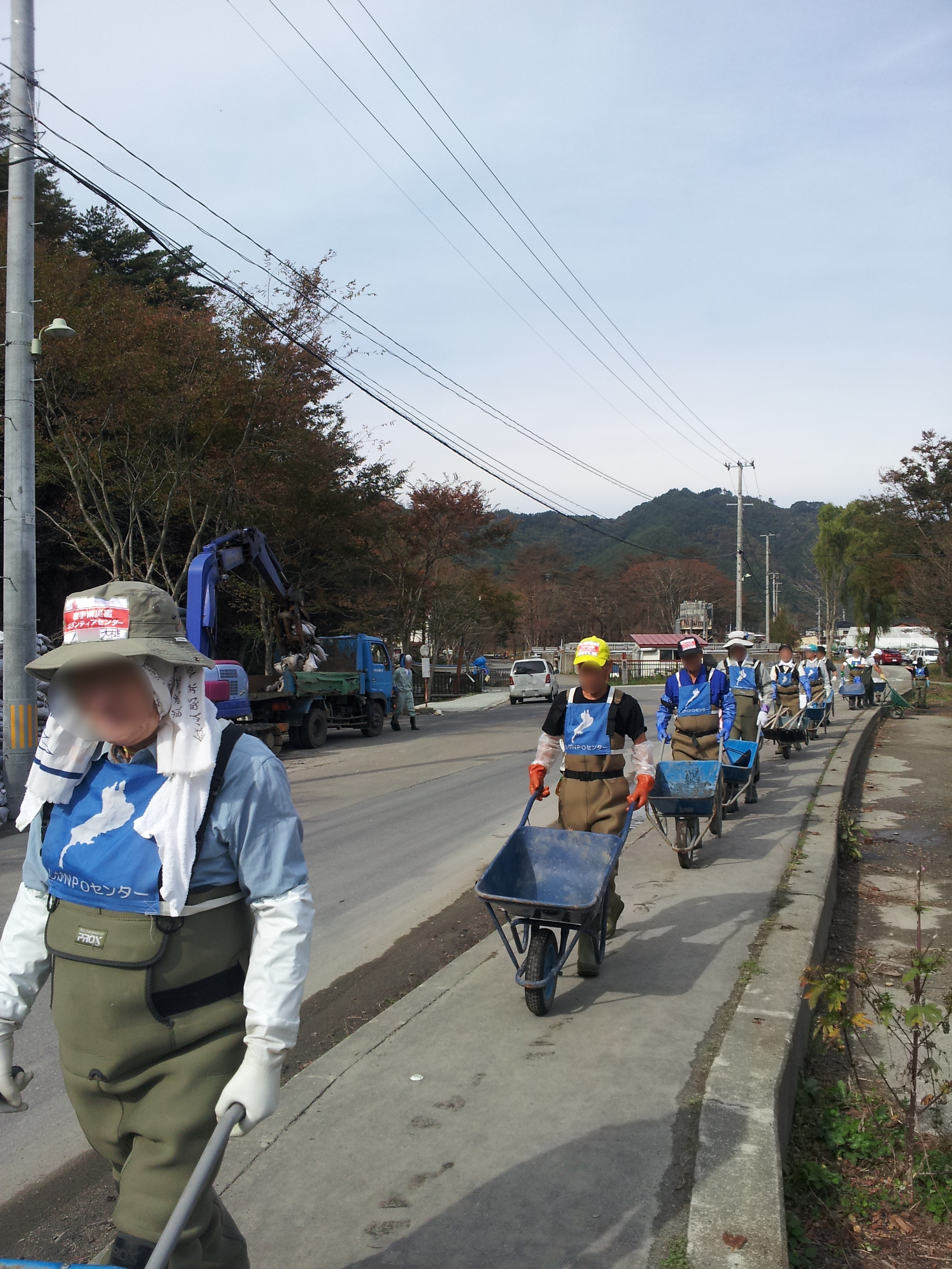 河川清掃をするため道具を持って源水川に向かうボランティアスタッフ
