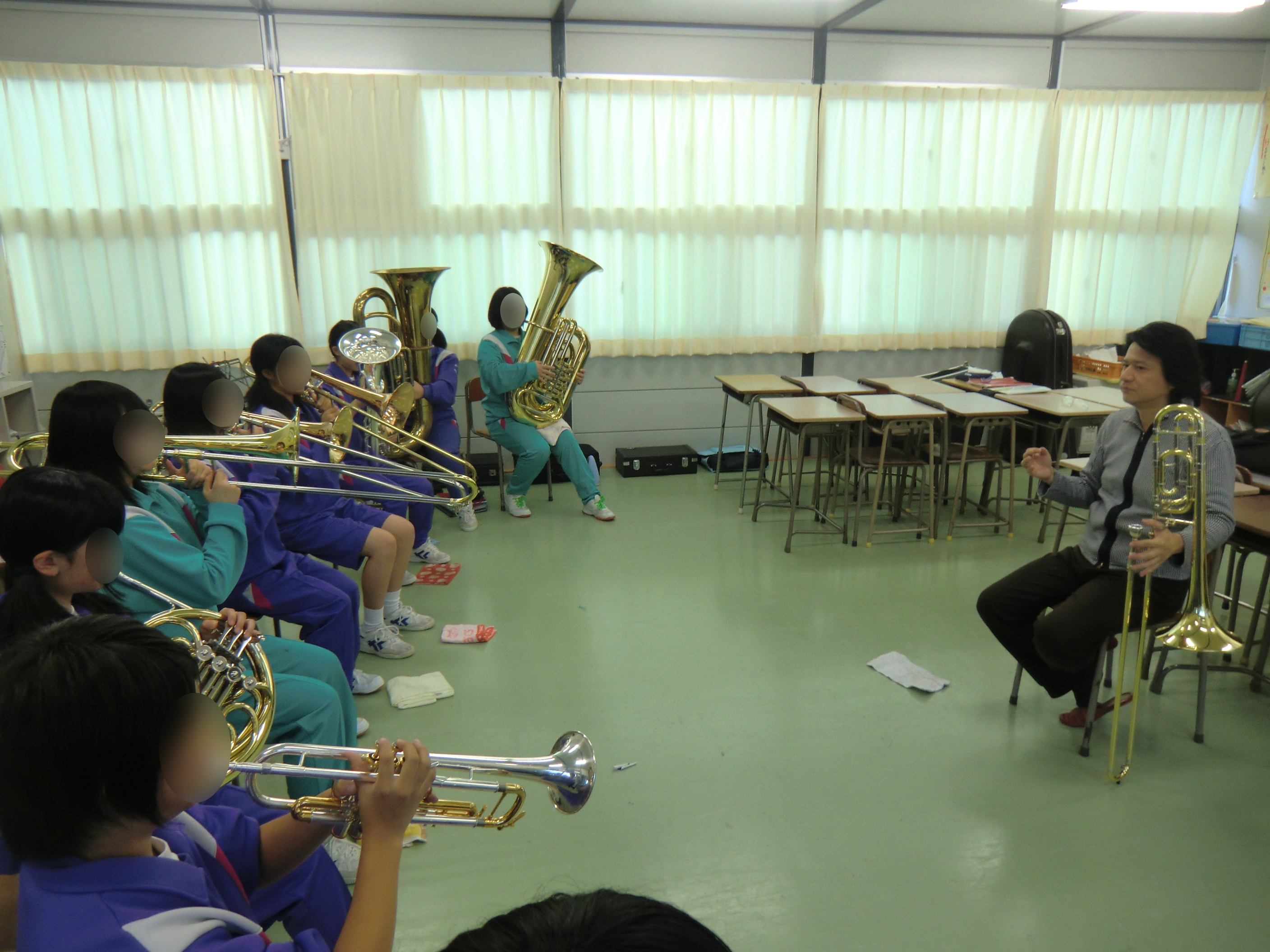 大槌中学校音楽室において、NHK交響楽団トロンボーン奏者 吉川武典氏から金管セクションの指導を受けている様子