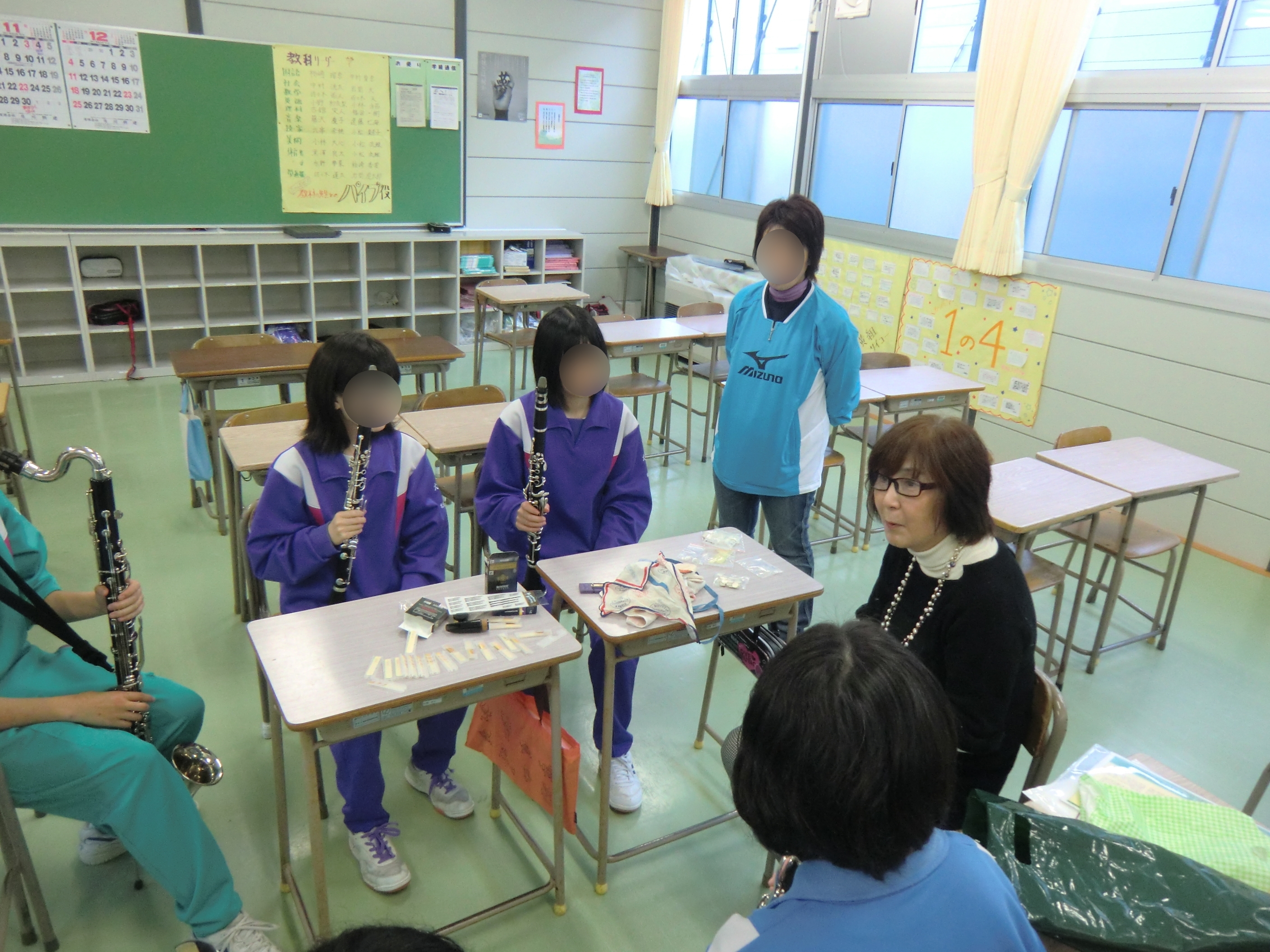 大槌中学校音楽室において、元東京シティフィルハーモニック管弦楽団クラリネット奏者 竹森かほり氏からクラリネットパートの指導を受けている様子