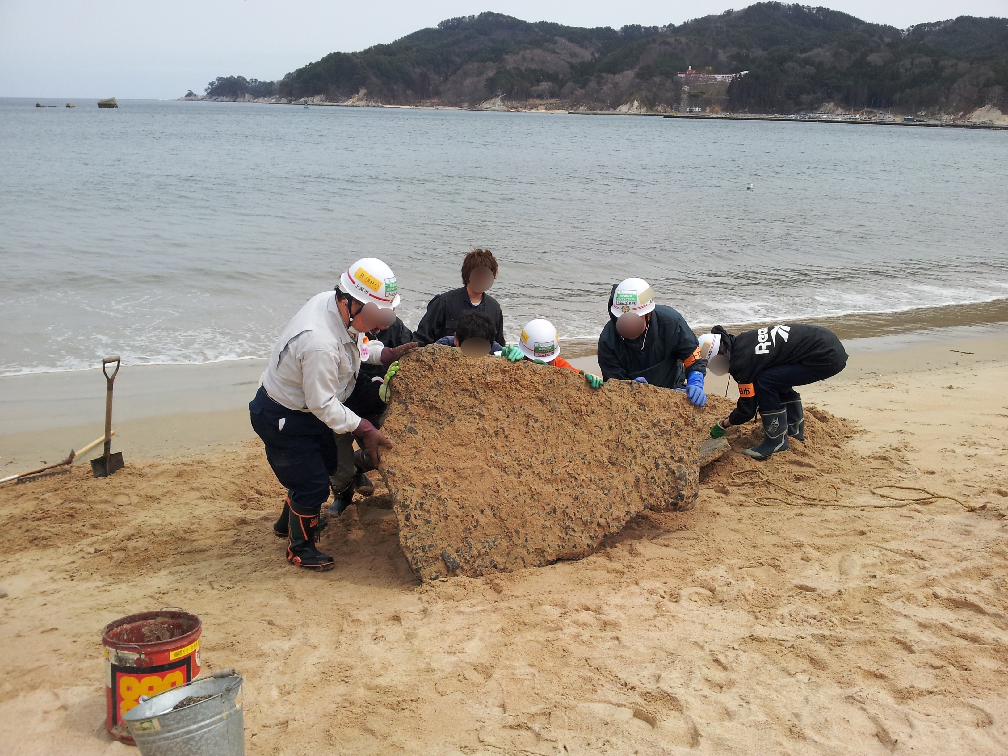 砂浜の中のガレキを分別して撤去している様子