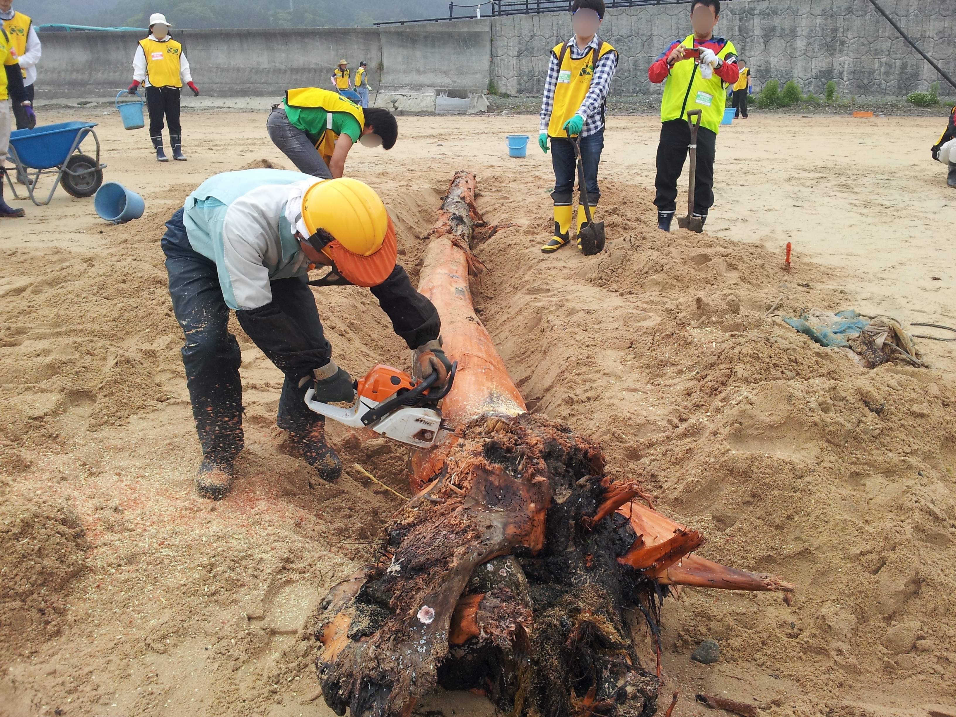 砂浜の中のガレキを分別して撤去している様子