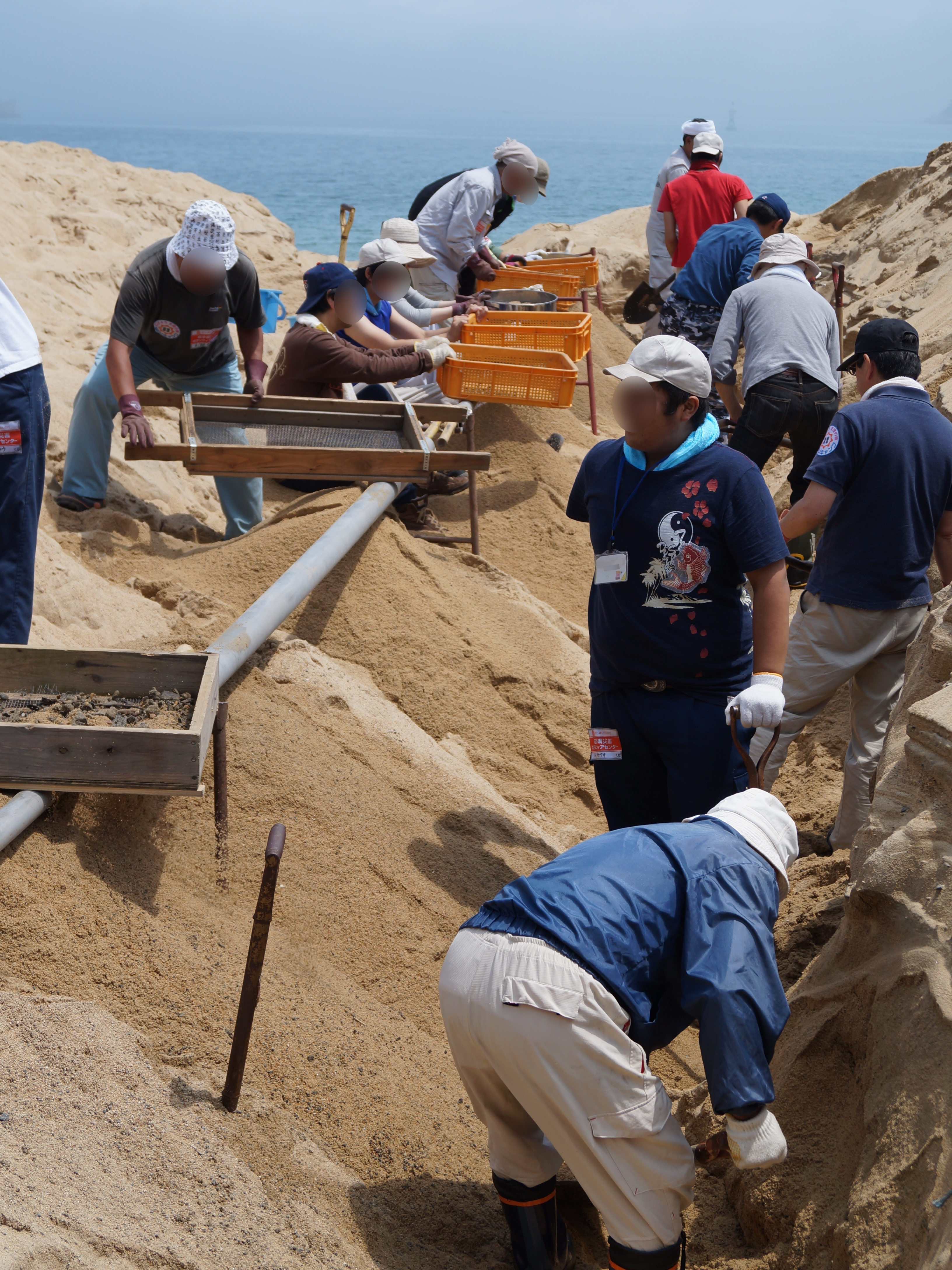 砂浜の中のガレキを分別して撤去している様子