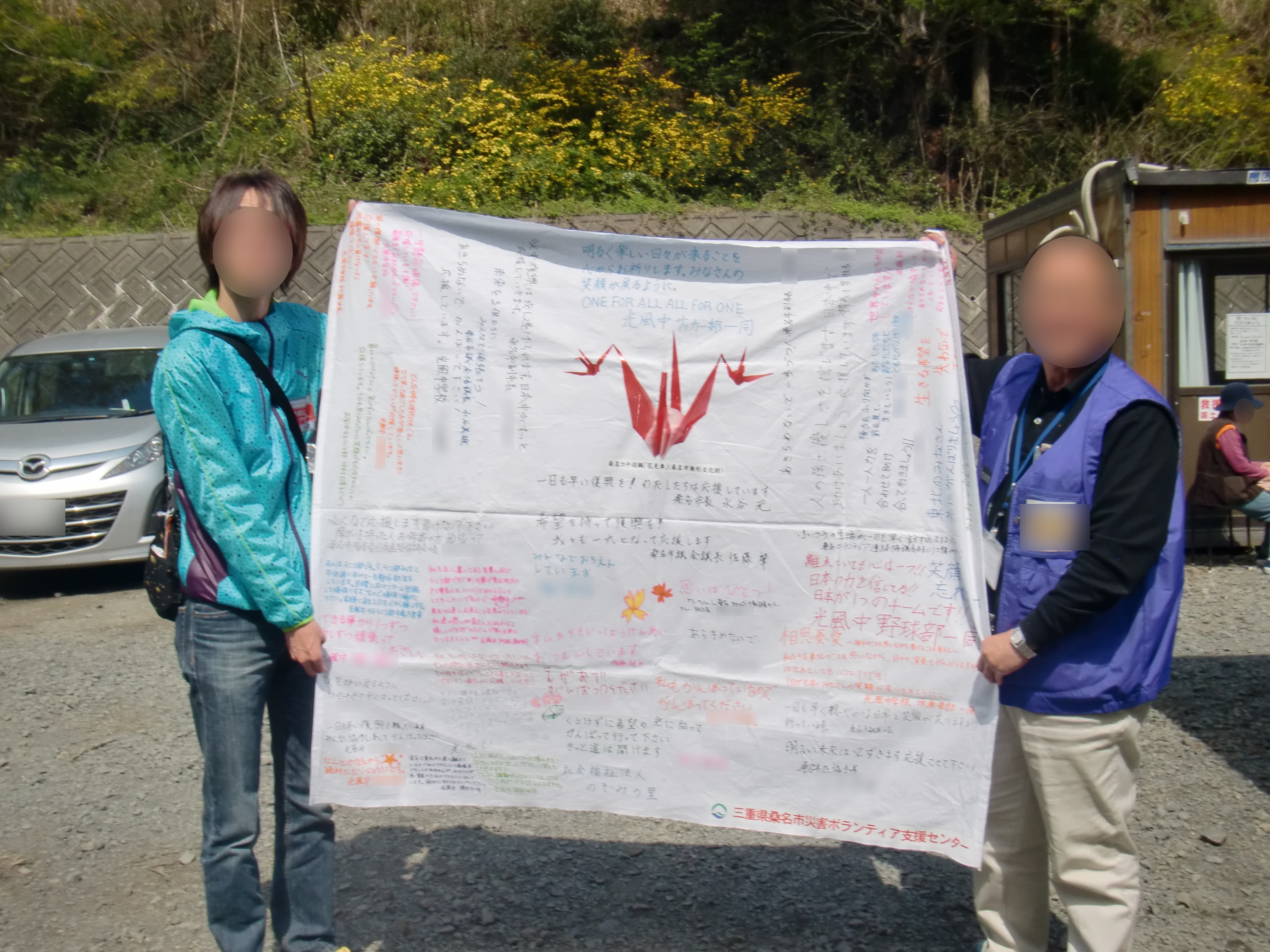 ボランティアからの寄せ書きを広げる大槌社協の人