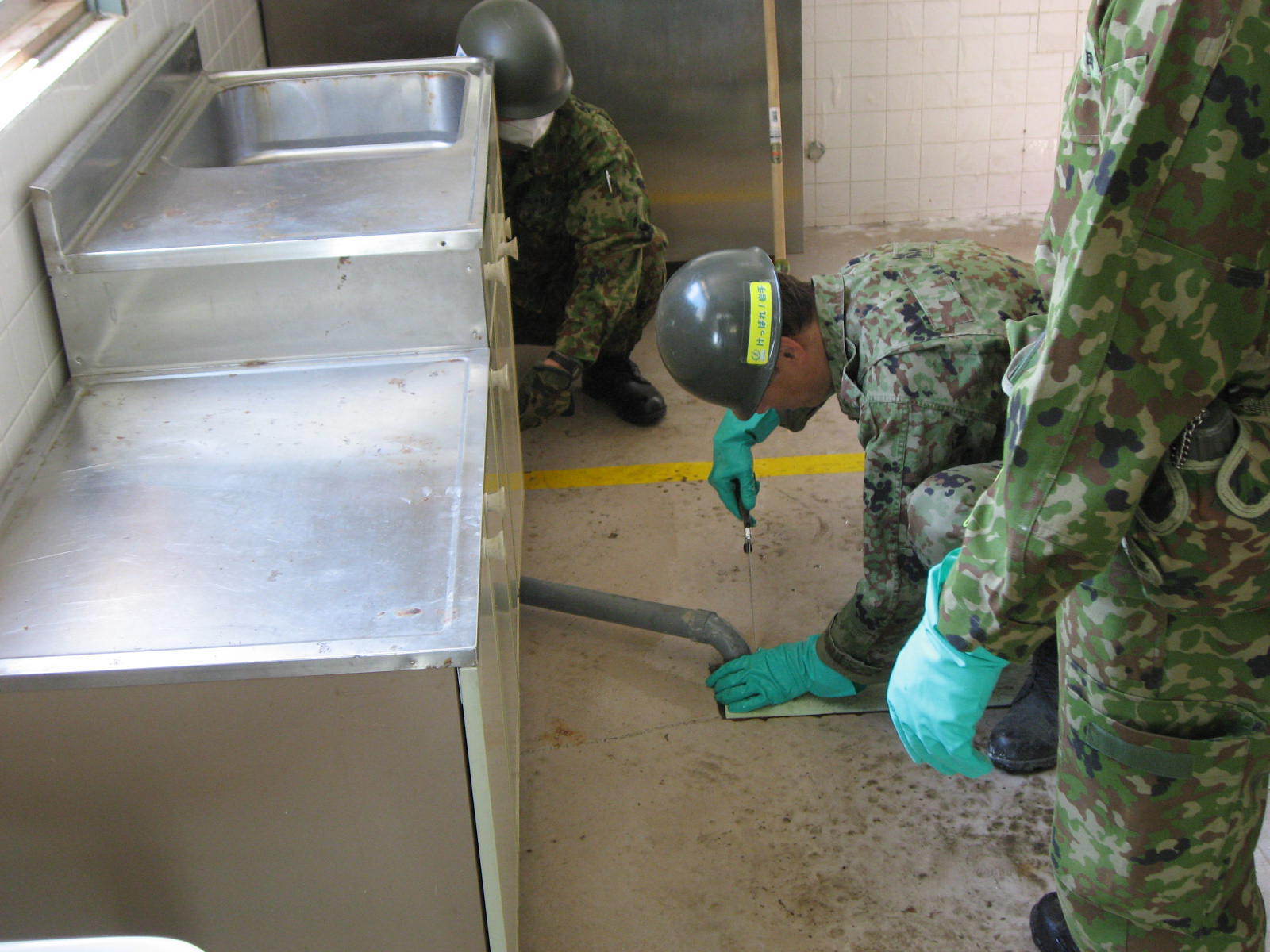 流し台の水回りを整備している自衛隊員の様子