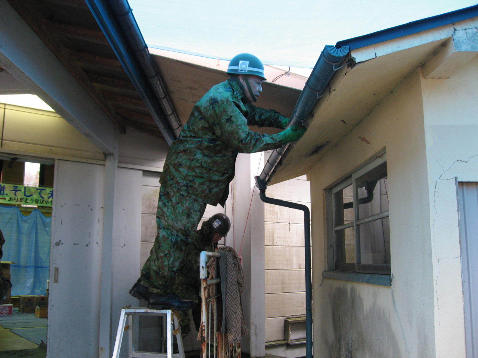 雨に濡れないよう建物の屋根の間にシートを張っている様子