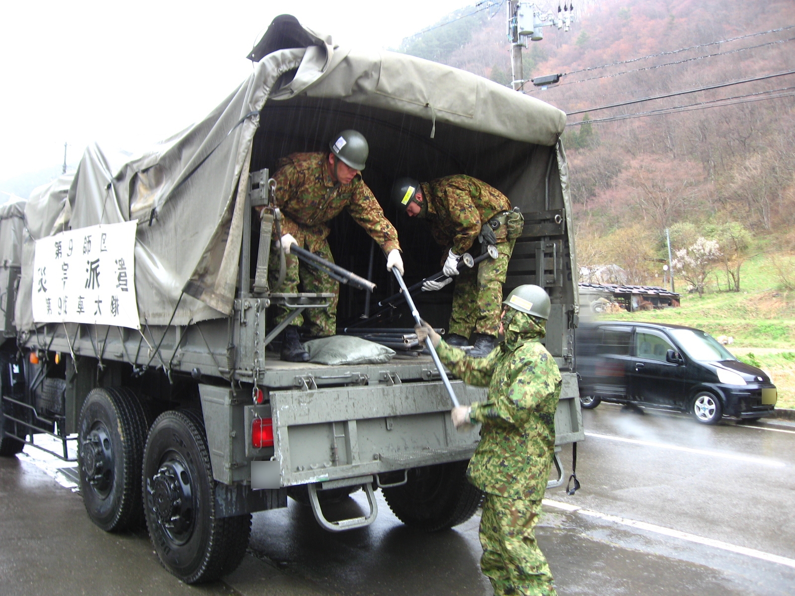 外の洗濯場に天幕を設営している自衛隊員の様子