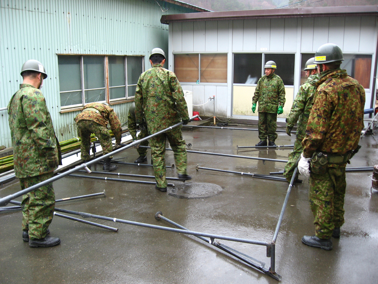 外の洗濯場に天幕を設置している自衛隊員の様子