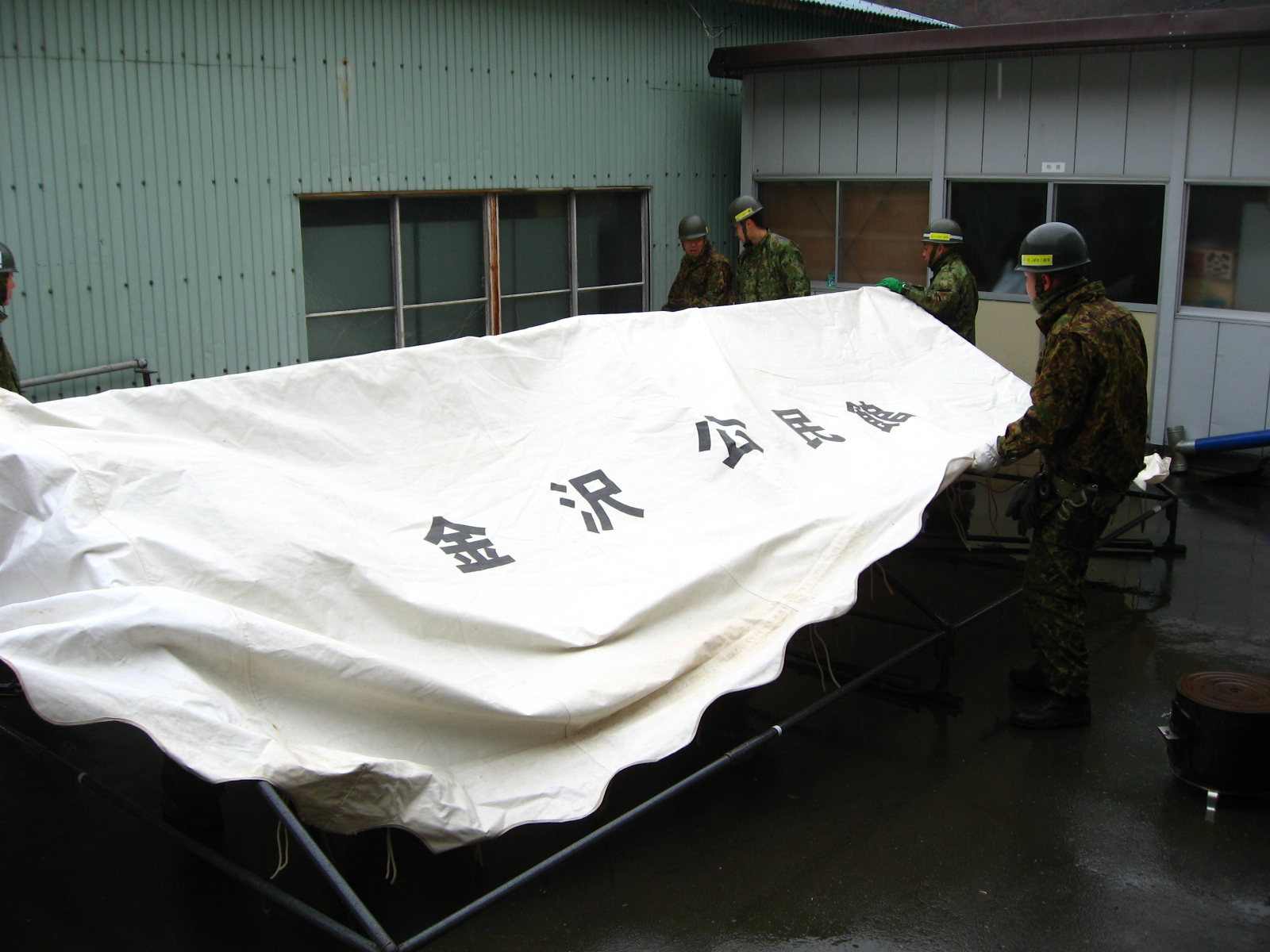 外の洗濯場に天幕を設置している自衛隊員の様子