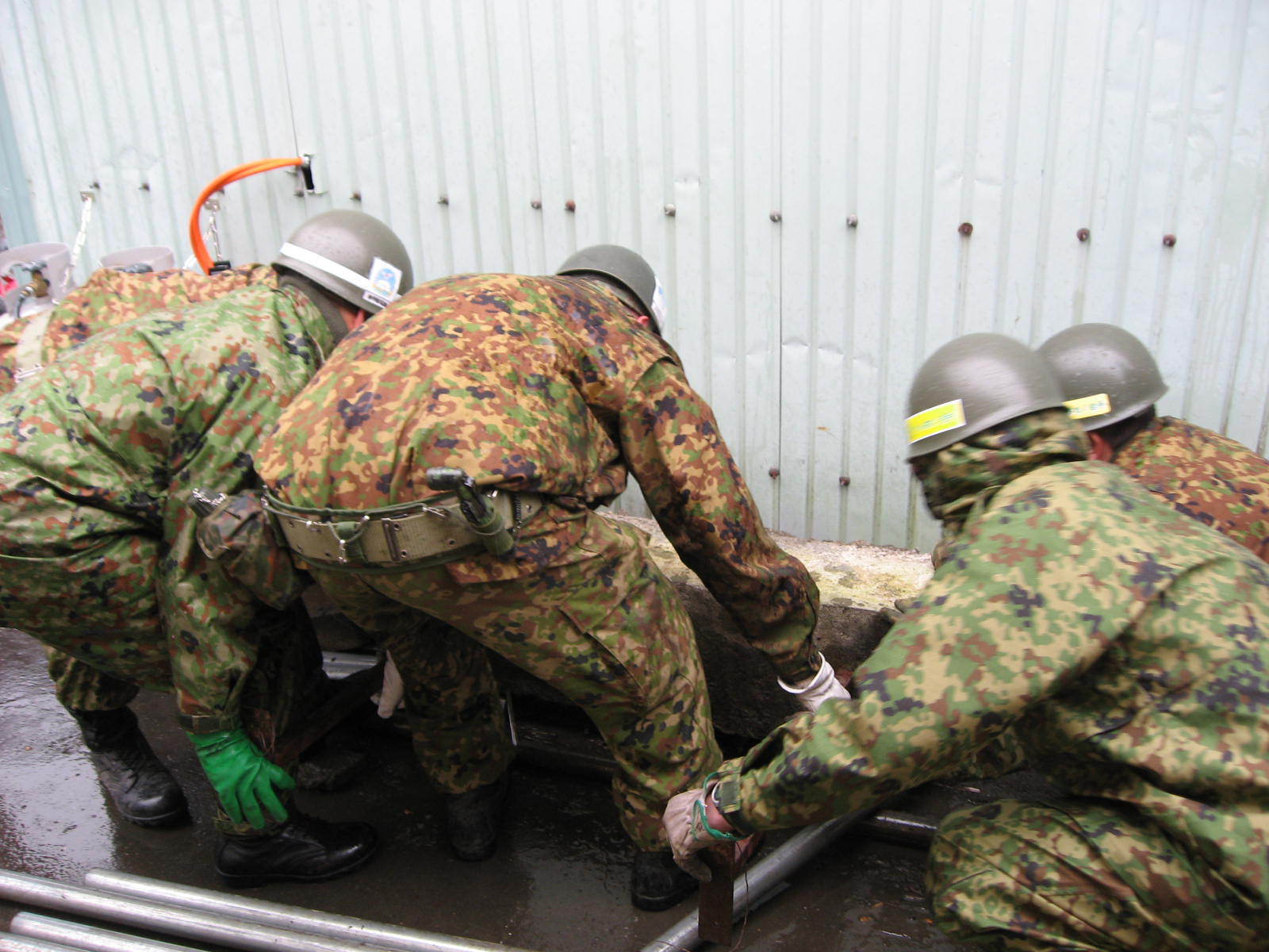 外の洗濯場に天幕を設置している自衛隊員の様子