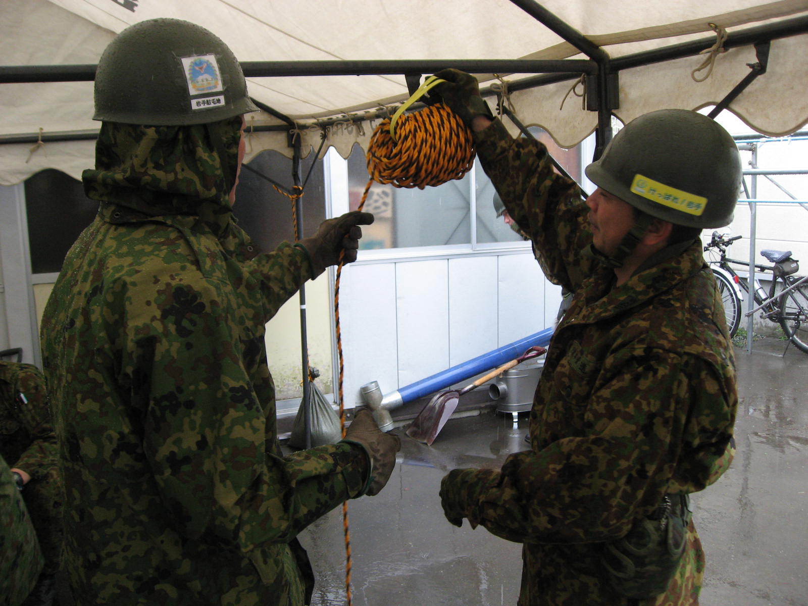 外の洗濯場に天幕を設置している自衛隊員の様子