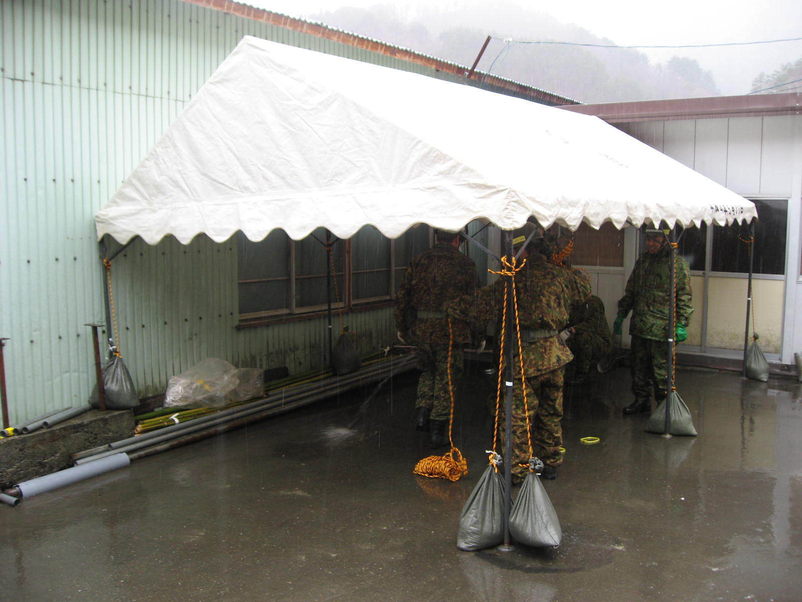 外の洗濯場に天幕を設置している自衛隊員の様子