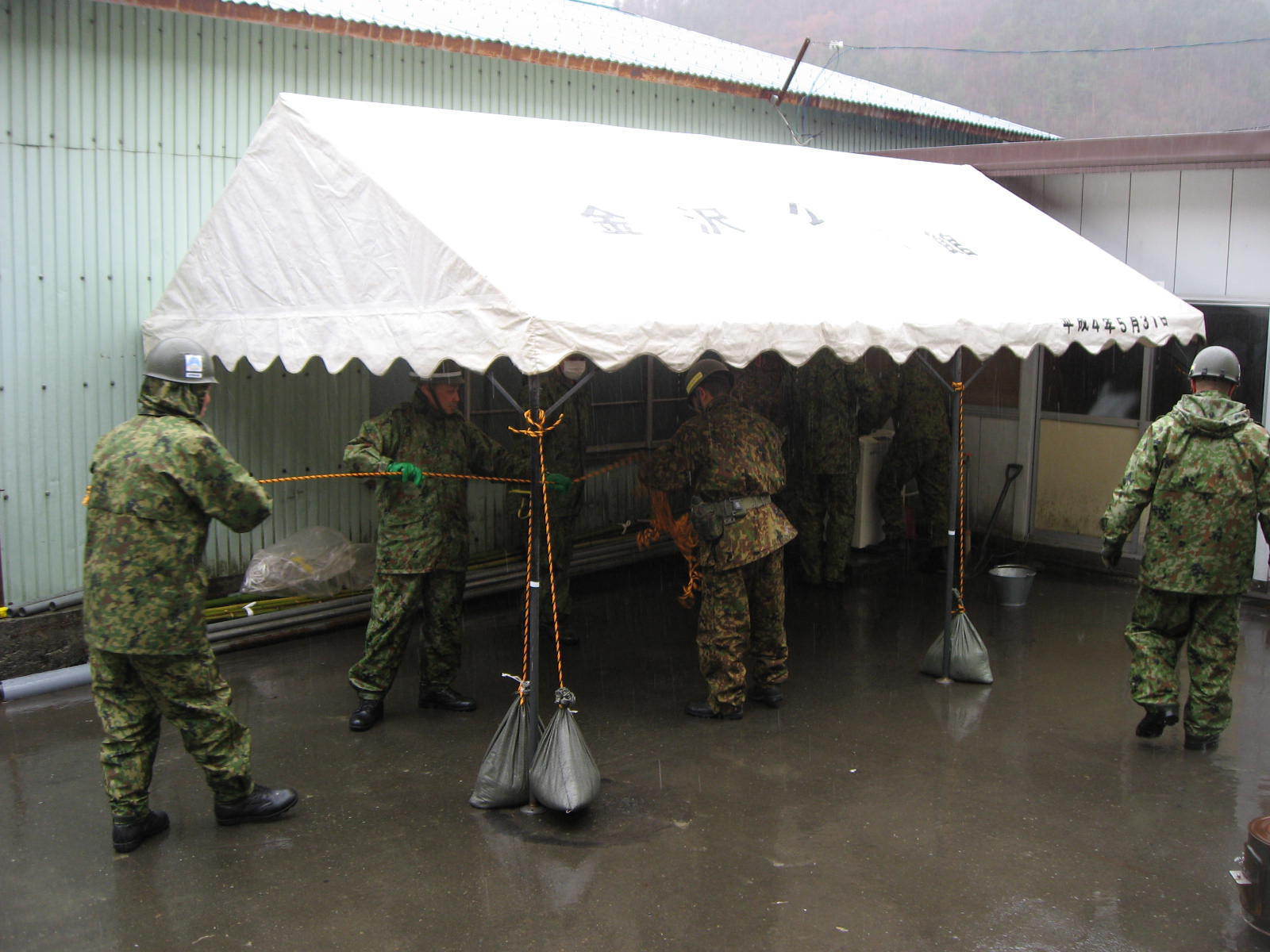 外の洗濯場に天幕を設置している自衛隊員の様子