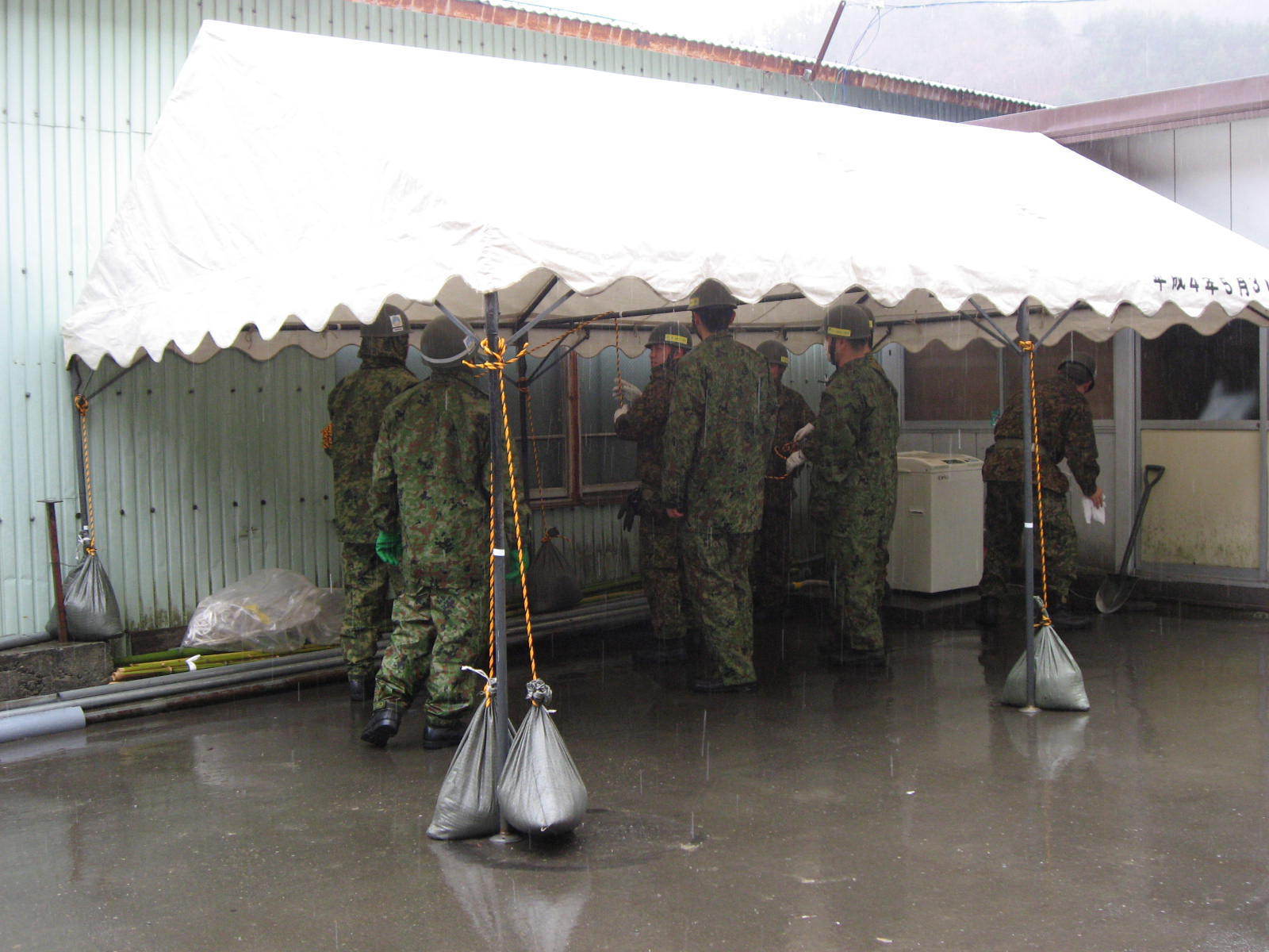 外の洗濯場に天幕を設置している自衛隊員の様子
