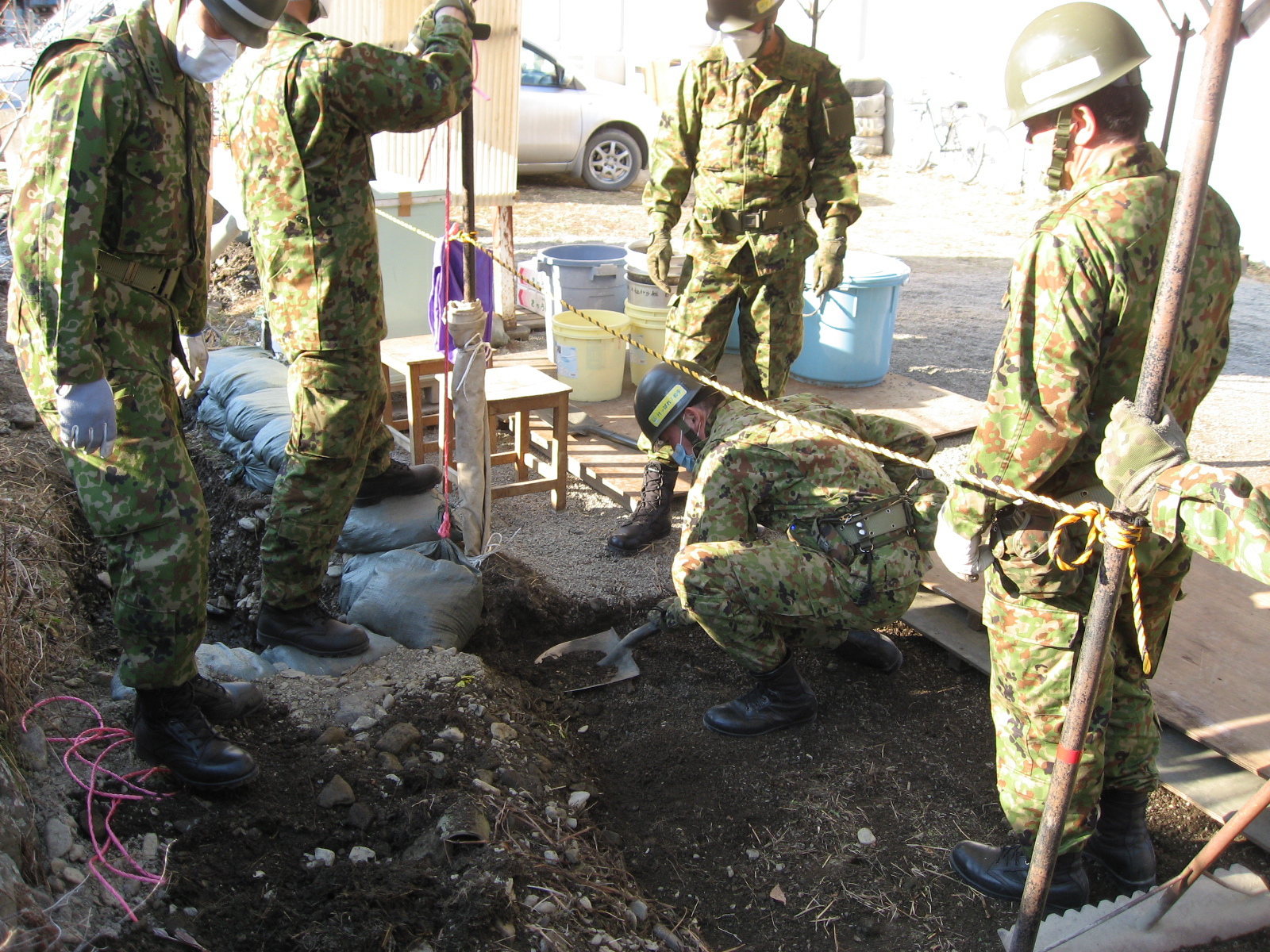 外に設置する洗い場の水回りを整備している自衛隊員の様子