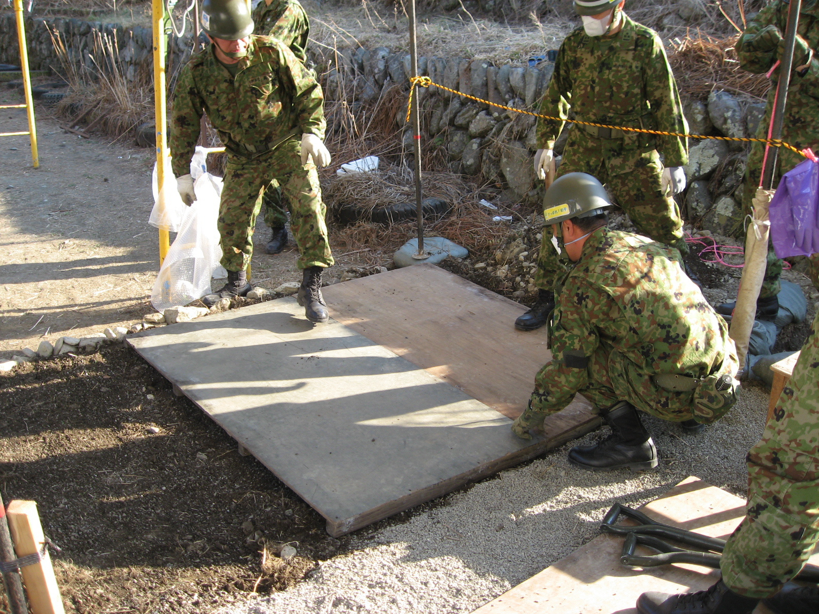 外に設置する洗い場の水回りを整備している自衛隊員の様子