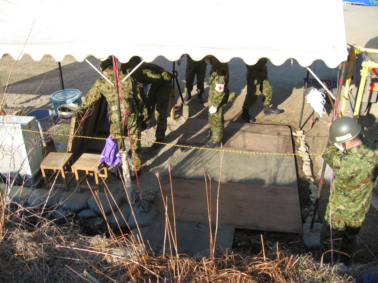 外に設置する洗い場の水回りを整備している自衛隊員の様子