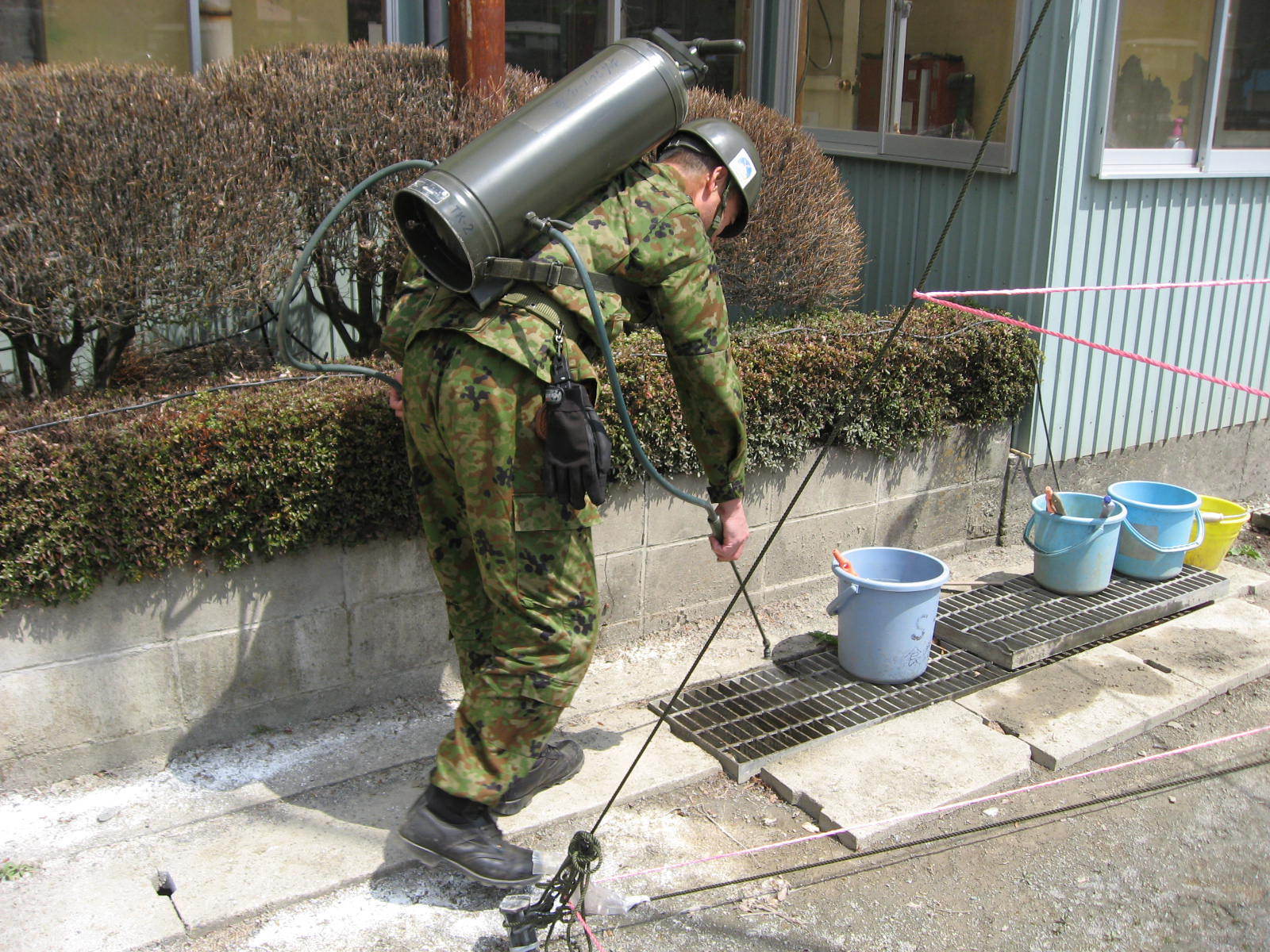 建物の周辺の消毒作業をしている自衛隊員の様子