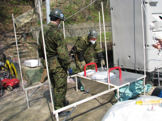 応急トイレ設置 拡大表示 ダウンロード 識別子 : 7062 タイトルよみ : オウキュウトイレセッチ 說明・要約 : 応急トイレを組み立てている自衛隊員 作成者(撮影者) : 自衛隊 作成者(撮影者)よみ : ジエイタイ 提供者 : 自衛隊 提供者よみ : ジエイタイ 撮影(作成)場所 : 岩手県上閉伊郡大槌町 撮影(作成)場所よみ : イワテケンカミヘイグンオオツチチョウ 作成日・撮影日 : 2011年 4月 30日 カテゴリー : 避難所 被災者支援 地域 : その他 備考 : 関連アーカイブ 応急トイレ設置 応急トイレ設置 応急トイレ設置 応急トイレ設置 応急トイレ設置 応急トイレ設置 応急トイレ設置 震災事象 住民(住居:避難所~仮設住宅~災害公営住宅) > 外部支援による運営体制構築 > 自衛隊・県警・消防が、避難所運営の手伝い開始