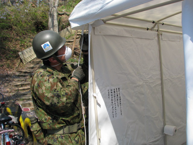 応急トイレ設置 拡大表示 ダウンロード 識別子 : 7073 タイトルよみ : オウキュウトイレセッチ 說明・要約 : 応急トイレを組み立てている自衛隊員 作成者(撮影者) : 自衛隊 作成者(撮影者)よみ : ジエイタイ 提供者 : 自衛隊 提供者よみ : ジエイタイ 撮影(作成)場所 : 岩手県上閉伊郡大槌町 撮影(作成)場所よみ : イワテケンカミヘイグンオオツチチョウ 作成日・撮影日 : 2011年 4月 30日 カテゴリー : 避難所 被災者支援 地域 : その他 備考 : 関連アーカイブ 応急トイレ設置 応急トイレ設置 応急トイレ設置 応急トイレ設置 応急トイレ設置 応急トイレ設置 応急トイレ設置 震災事象 住民(住居:避難所~仮設住宅~災害公営住宅) > 外部支援による運営体制構築 > 自衛隊・県警・消防が、避難所運営の手伝い開始
