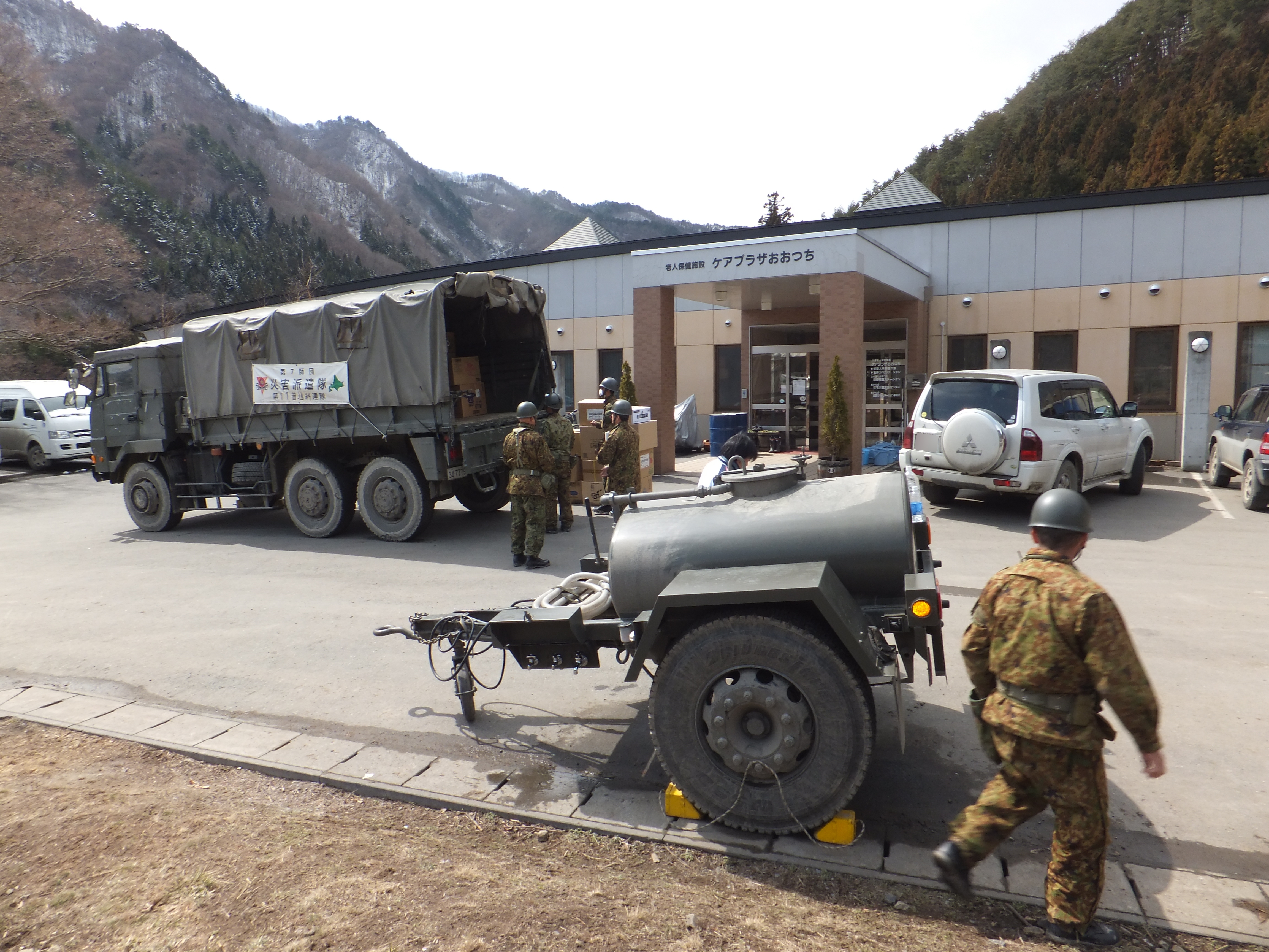 避難所 拡大表示 ダウンロード 識別子 : 7083 タイトルよみ : ヒナンジョ 說明・要約 : 避難所ケアプラザおおつちの入口 作成者(撮影者) : 自衛隊 作成者(撮影者)よみ : ジエイタイ 提供者 : 自衛隊 提供者よみ : ジエイタイ 撮影(作成)場所 : 岩手県上閉伊郡大槌町 小鎚 撮影(作成)場所よみ : イワテケンカミヘイグンオオツチチョウ コヅチ 作成日・撮影日 : 2011年 3月 27日 カテゴリー : 避難所 被災者支援 地域 : 小鎚・臼澤地区 備考 : 震災事象 住民(住居:避難所~仮設住宅~災害公営住宅) > 外部支援による運営体制構築 > 自衛隊・県警・消防が、避難所運営の手伝い開始