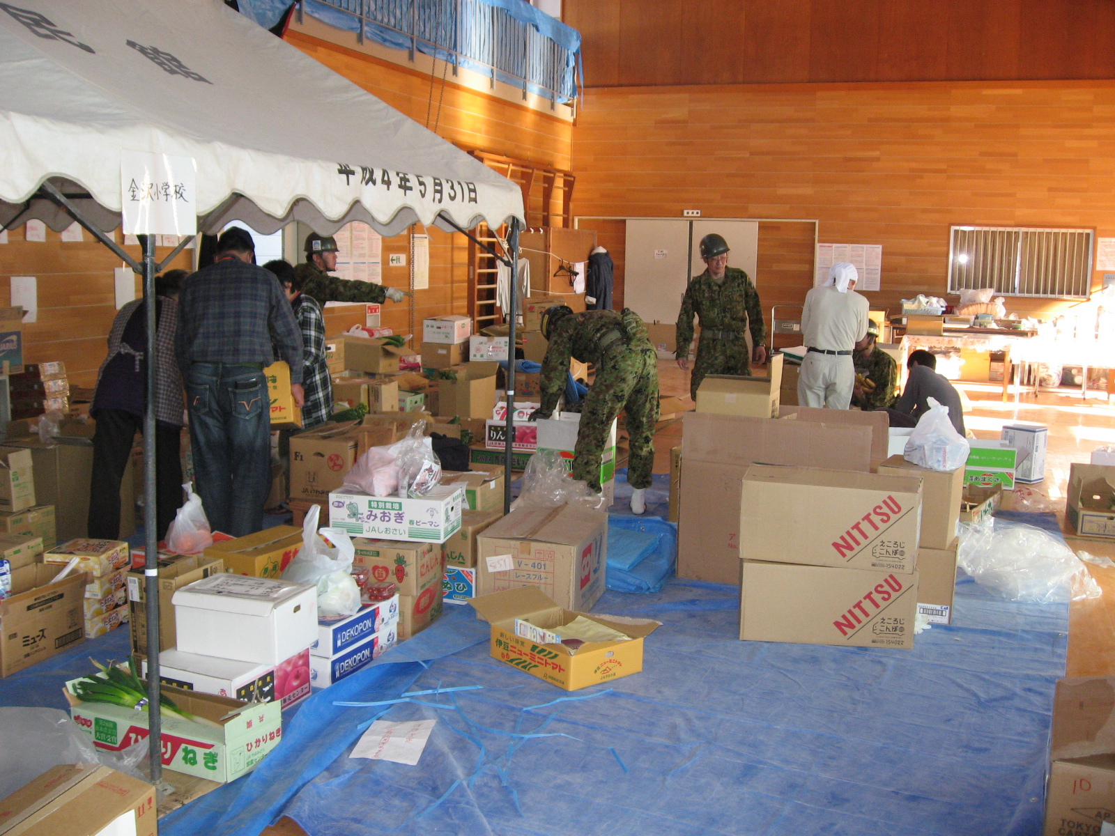 避難所に支援物資を配達している自衛隊員