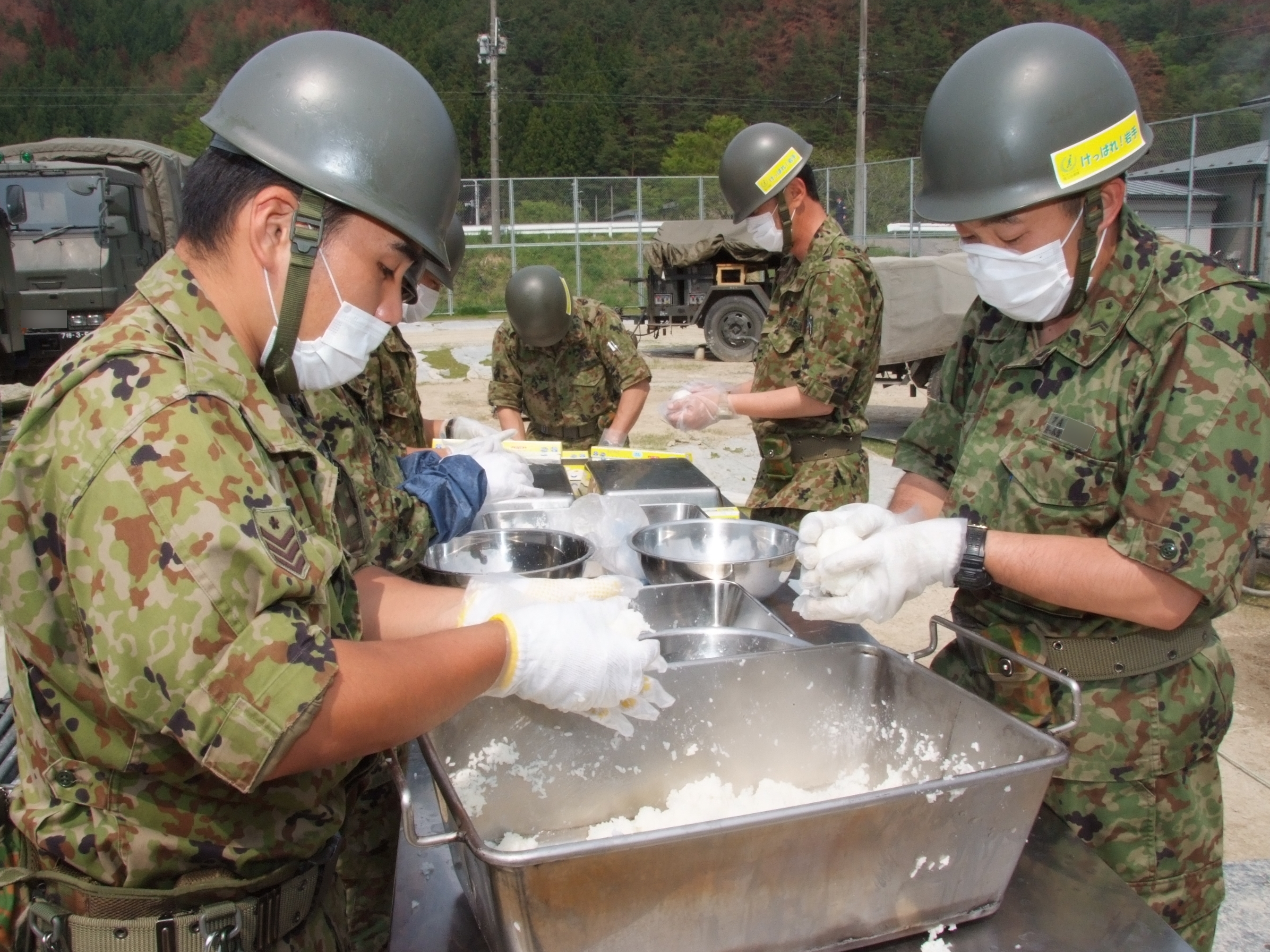避難所の給食支援でおにぎりを握っている自衛隊員